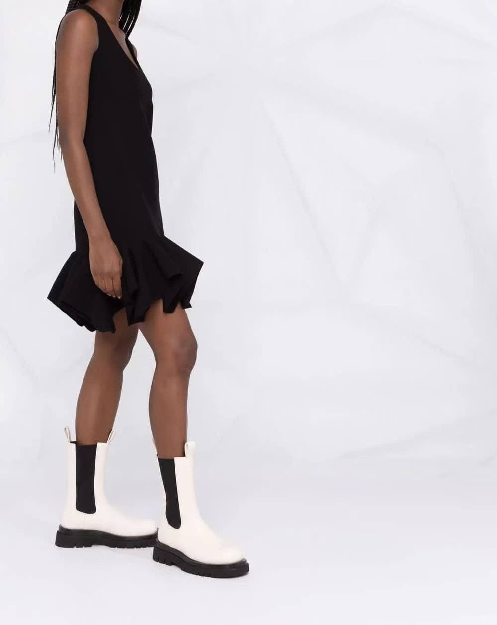 Платье Bottega Veneta LUX-58708 представляет собой элегантное и стильное решение для современной женщины. Это мини-платье без рукавов выполнено в классическом черном цвете, но его изюминкой является объемный волан по подолу, который придает образу игривости и динамичности. Бренд Bottega Veneta известен своим безупречным качеством и вниманием к деталям, что отражено и в этой модели, созданной для ценителей минимализма с эффектными акцентами.