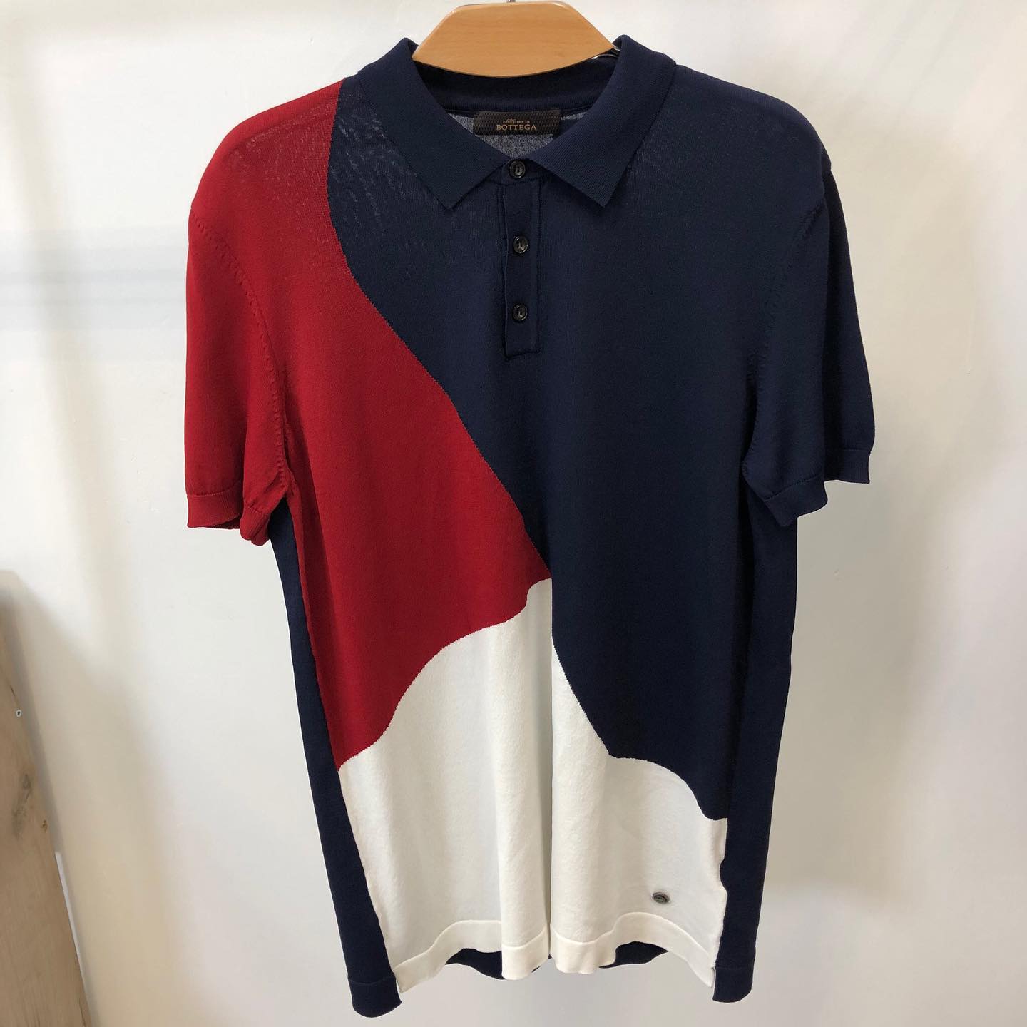 Поло Bottega Veneta LUX-33570 — это стильная и современная вещь, выполненная в уникальном дизайне. Сочетание контрастных цветов — синего, красного и белого — создает эффектный образ. Классический воротник и планка с пуговицами подчеркивают элегантность модели.