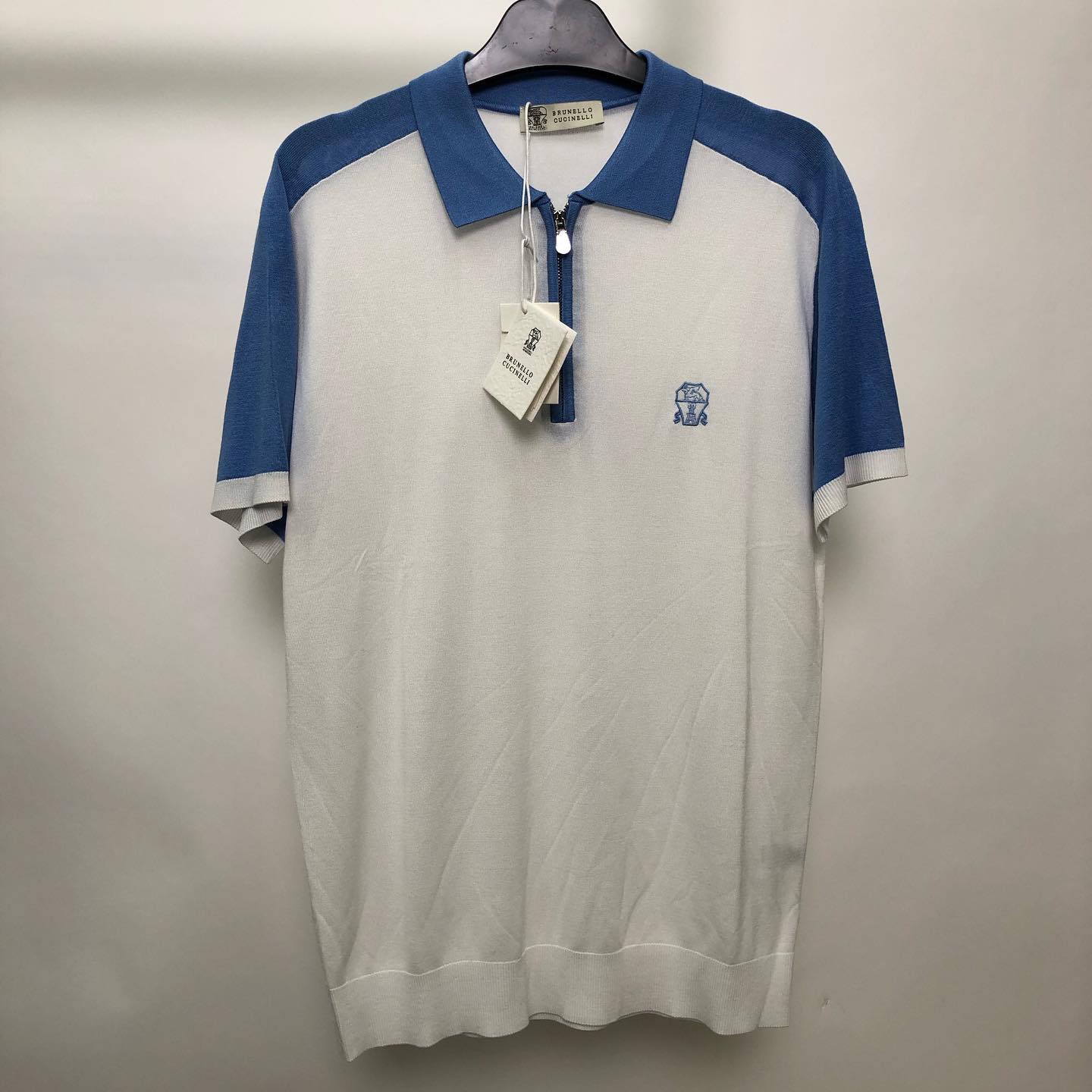 Поло Bottega Veneta LUX-44875 представляет собой стильный предмет гардероба, выполненный в классическом дизайне с современными акцентами. Это поло с короткими рукавами и воротником-стойкой, дополненным застежкой-молнией, сочетает в себе элегантность и комфорт. Контрастная цветовая блок-схема, где белоснежный корпус сочетается с ярко-синими рукавами и воротником, придает изделию выразительность. Небольшая вышивка на груди добавляет эксклюзивности.