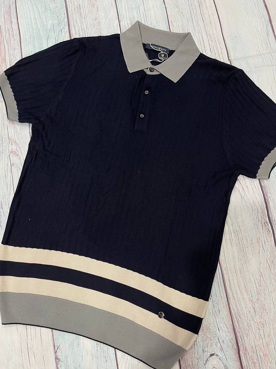 Элегантное мужское поло Bottega Veneta LUX-64859 выполнено в классическом темно-синем цвете, дополненном контрастной серой отделкой воротника и манжет. Оригинальный дизайн подчеркивается горизонтальными полосами в нижней части изделия, придавая ему утонченный вид. Этот предмет одежды идеально подходит для создания стильных повседневных и полуформальных образов.