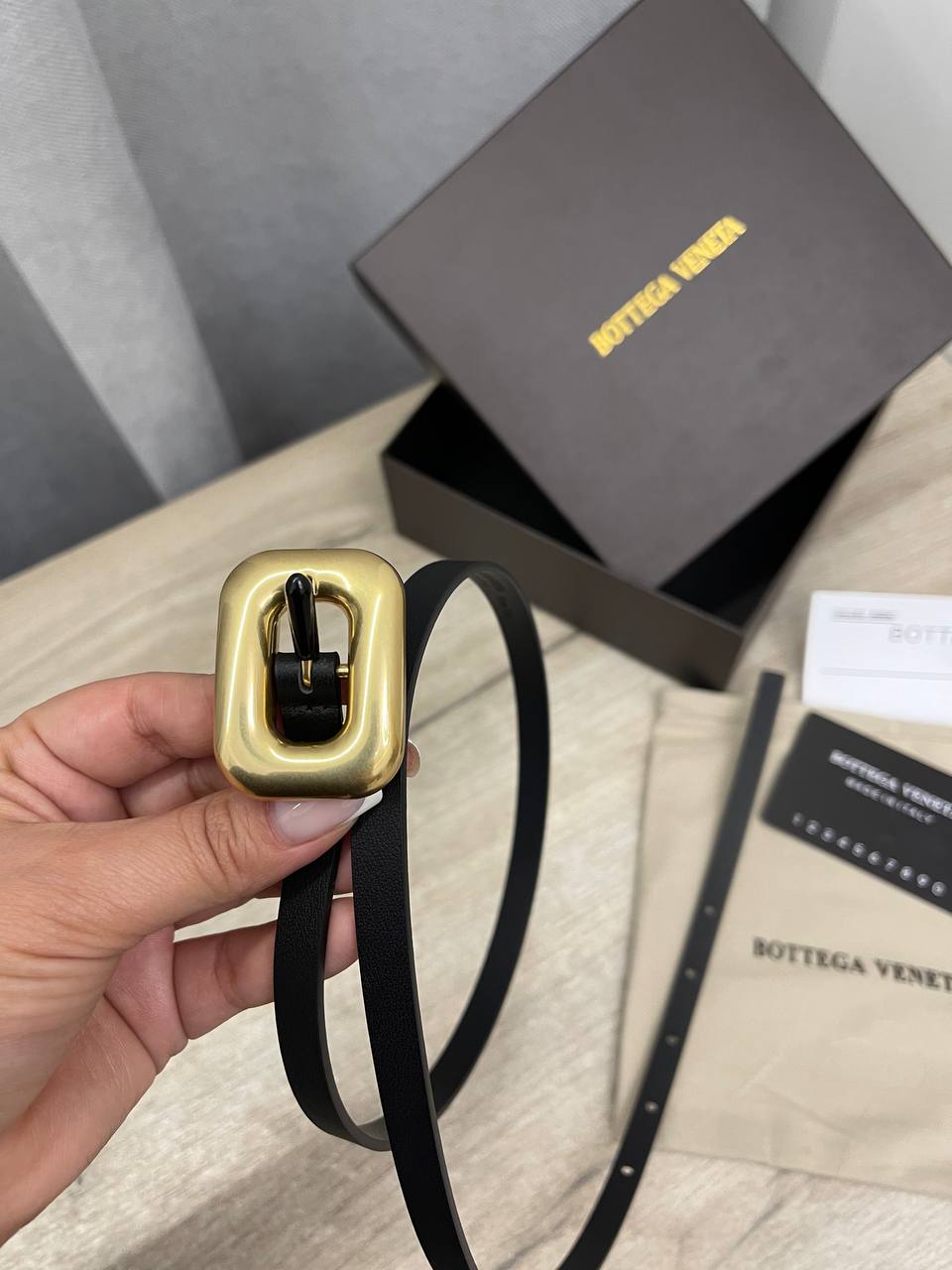 Ремень Bottega Veneta LUX-101762 представляет собой изысканный аксессуар, который подчеркнет ваш стиль. Тонкий черный ремень с золотой пряжкой выглядит элегантно и универсально, подходя как для повседневного, так и для вечернего образа.