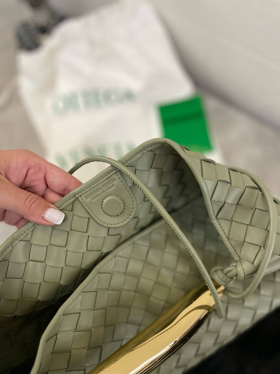 Сумка женская Bottega Veneta LUX-97841 выполнена в фирменном стиле бренда. Нежная текстура выполнена из плетеного материала нежного зеленого цвета. Данная сумка станет идеальным дополнением к повседневному или вечернему образу.