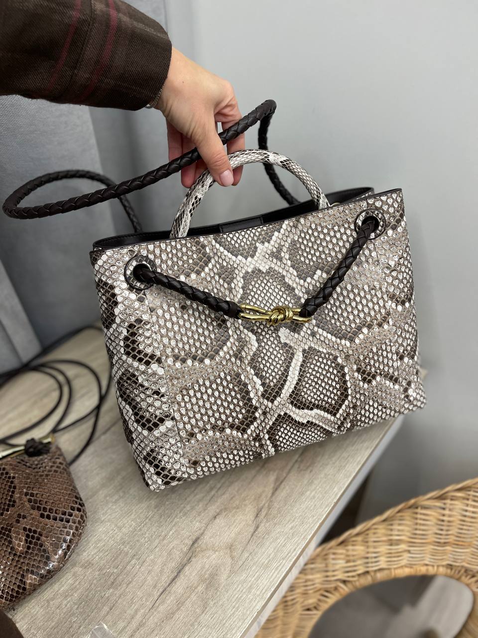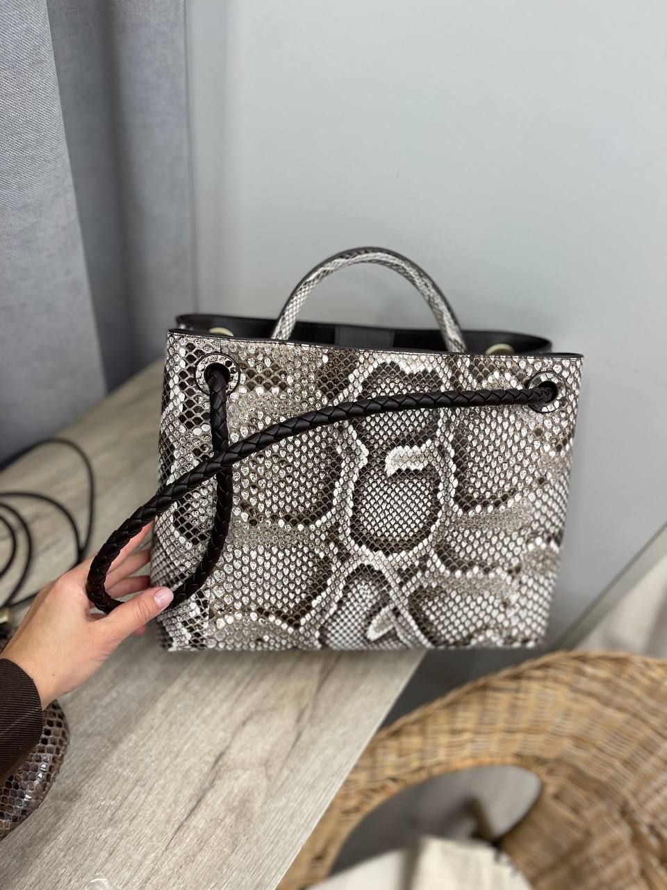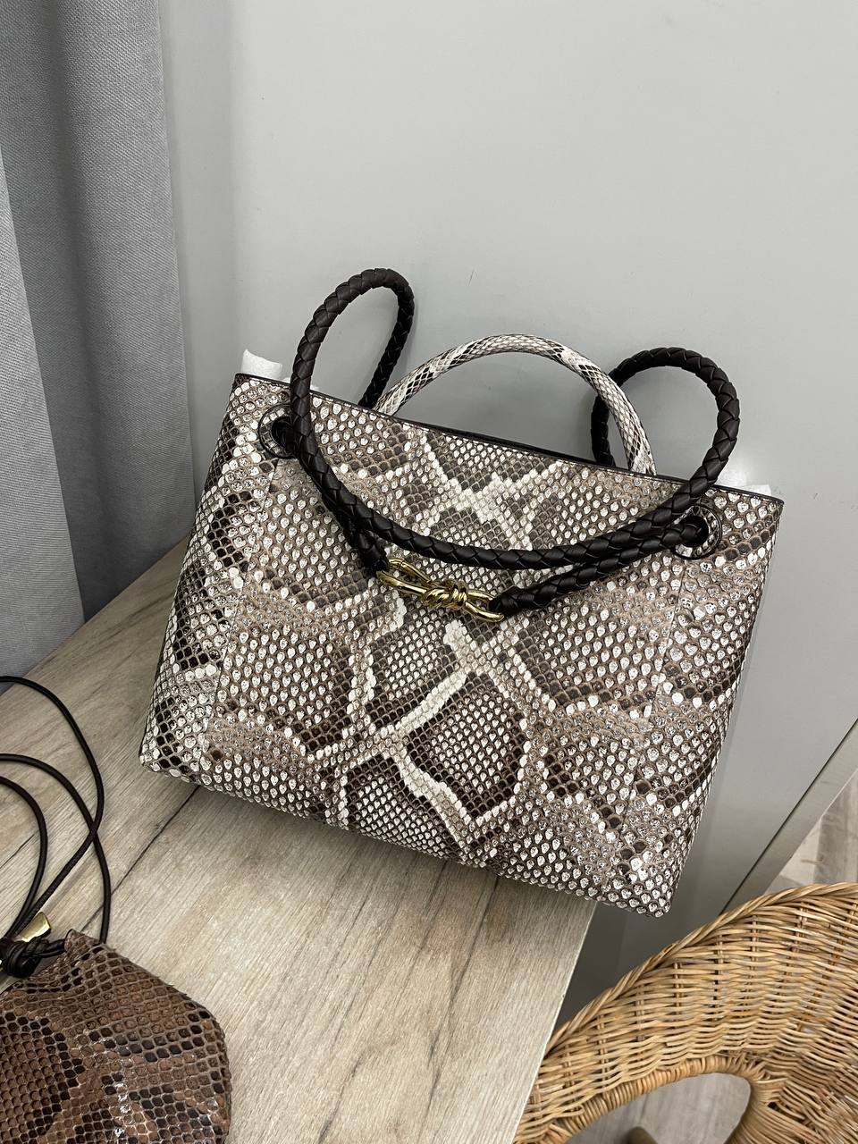Сумка женская 32 см Bottega Veneta LUX-113262 - это изысканный аксессуар, сочетающий в себе элегантность и практичность. Сумка выполнена в коричневых и белых тонах с узором под змеиную кожу. Идеально подойдет для повседневного использования и вечерних выходов, дополняя образ своей обладательницы.