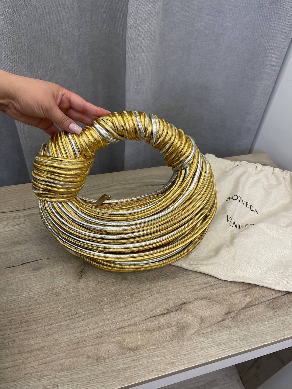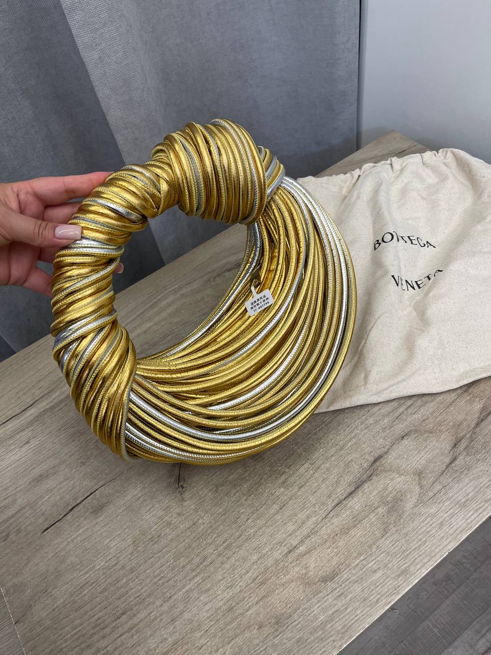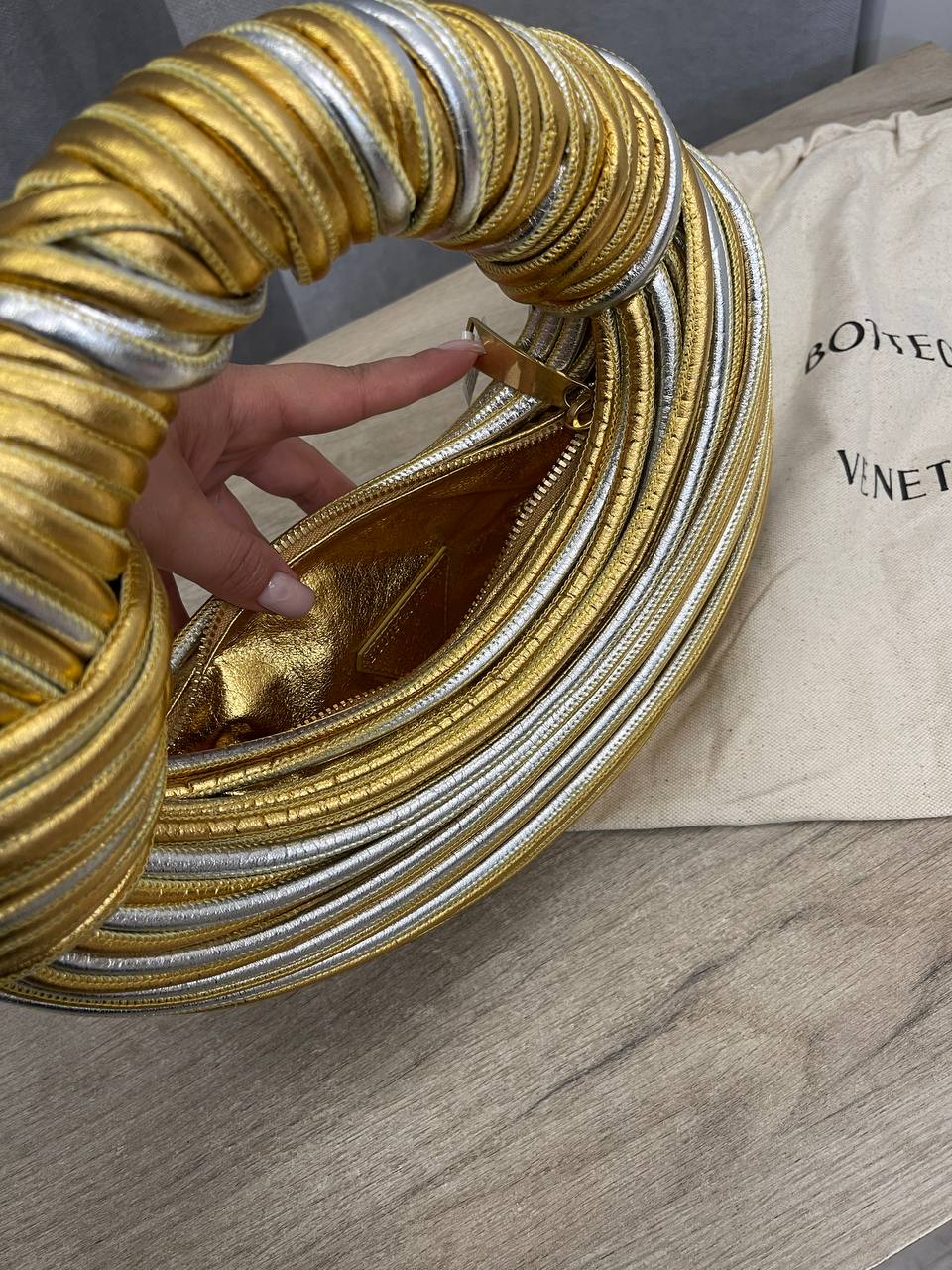 Сумка женская Bottega Veneta LUX-106904 представляет собой уникальный аксессуар в форме круга, выполненный в золотистом и серебристом цветах. Ее дизайн акцентирует внимание на текстуре, создавая эффектный и современный вид. Сумка подойдет для создания ярких образов, как для повседневной носки, так и для особых случаев.