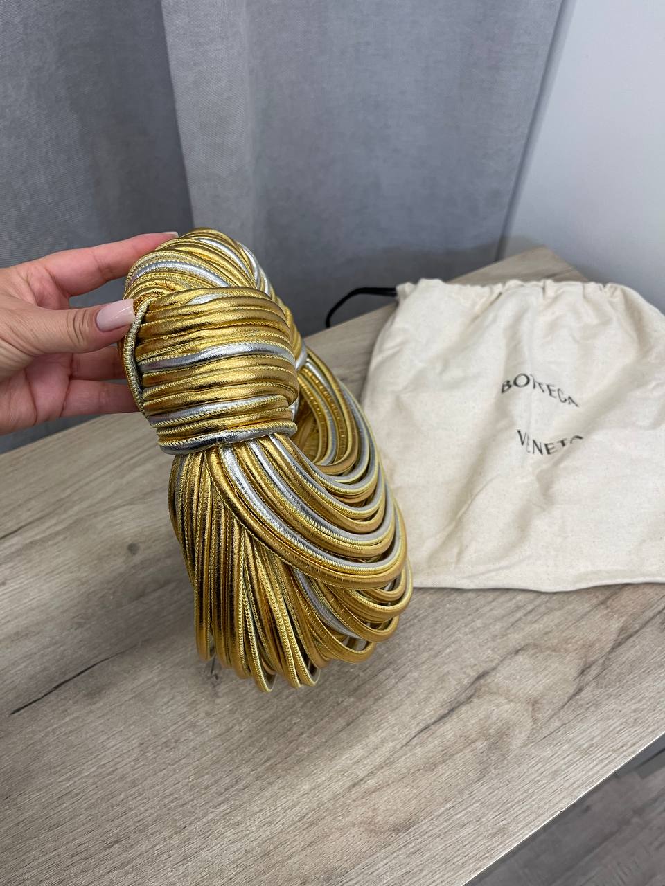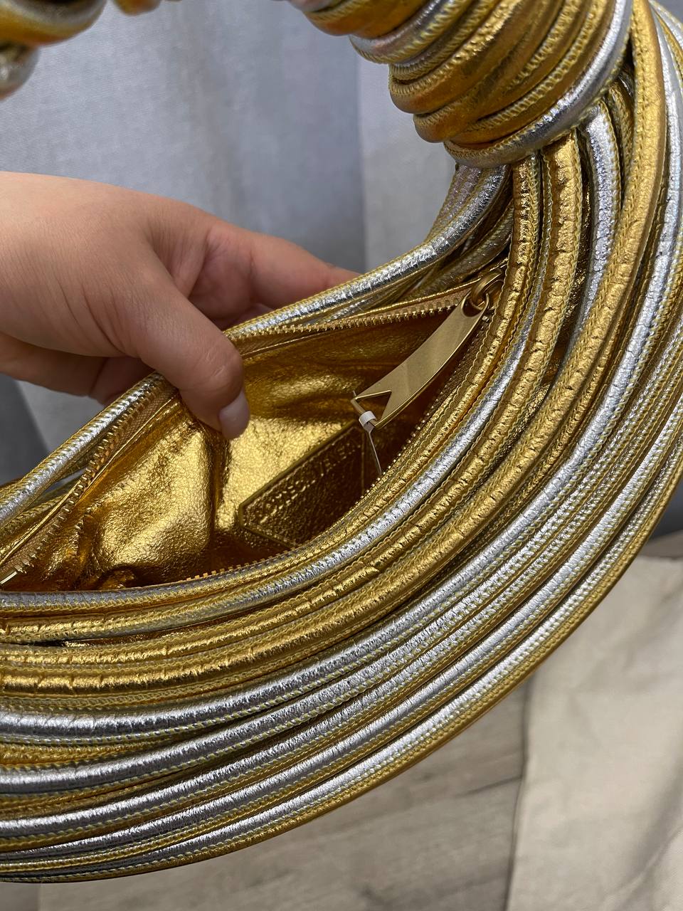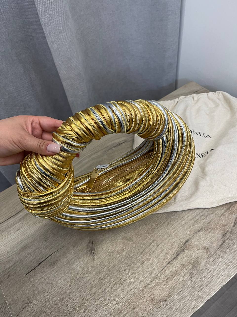 Сумка женская Bottega Veneta LUX-106904 представляет собой уникальный аксессуар в форме круга, выполненный в золотистом и серебристом цветах. Ее дизайн акцентирует внимание на текстуре, создавая эффектный и современный вид. Сумка подойдет для создания ярких образов, как для повседневной носки, так и для особых случаев.