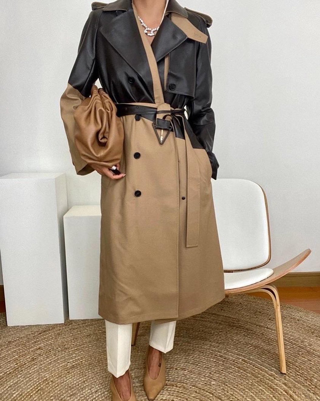 Тренч Bottega Veneta LUX-36511 представляет собой элегантную модель, сочетающую классический крой с современными элементами. Изделие выполнено в стиле колор-блок, где верхняя часть и рукава выполнены из черной кожи, а нижняя часть и спинка — из плотной хлопковой ткани контрастного бежевого оттенка. Этот тренч станет эффектным дополнением к вашему гардеробу, подчеркивая индивидуальность и чувство стиля.