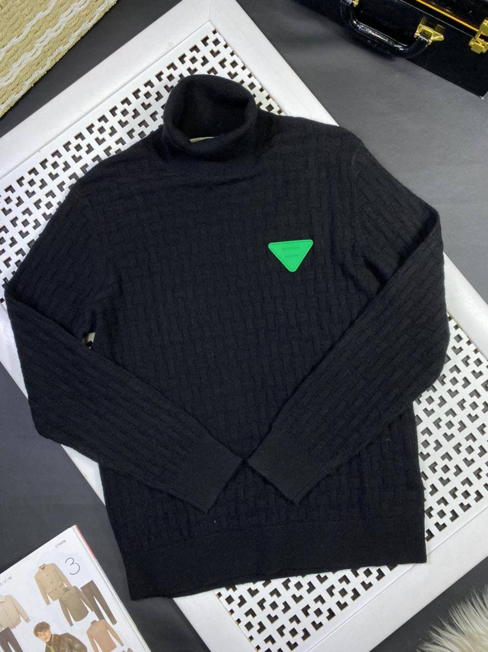 Водолазка Bottega Veneta LUX-61243 представляет собой элегантный и стильный предмет гардероба, выполненный в классическом черном цвете. Акцент в дизайне сделан на фактурный узор по всей поверхности изделия и яркий зеленый треугольный логотип бренда, расположенный на груди. Эта водолазка идеально подходит для создания как повседневных, так и более утонченных образов.