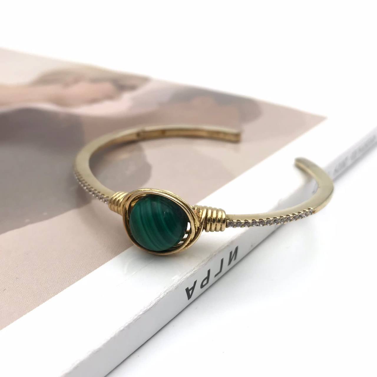Браслет LUX-65102 от LUXE-CRIME – это изысканное украшение, выполненное в классическом стиле с элементами природной красоты. Центральным элементом является гладкий, полированный камень малахит, обрамленный изящной золотистой проволокой. Браслет декорирован мелкими кристаллами, которые мерцают на солнце, добавляя блеска. Это элегантное дополнение к любому образу, подчеркивающее утонченный вкус.
