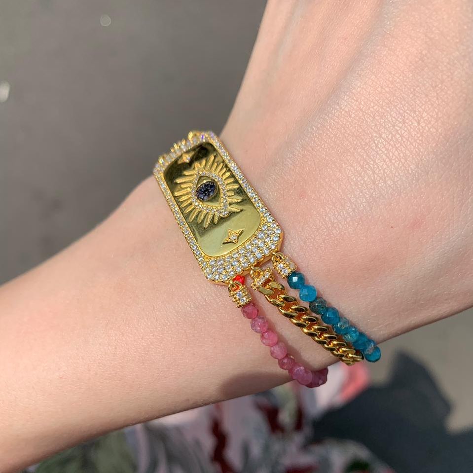 Браслет LUX-15074 от LUXE-CRIME представляет собой изысканное украшение в стиле арт-деко, сочетающее в себе золотистые оттенки и сверкающие элементы. Центральный элемент выполнен в форме прямоугольной пластины с изображением солнца и глаза, инкрустированный мелкими камнями. От него спускаются три цепочки, украшенные разноцветными бусинами, добавляющими яркости и уникальности.