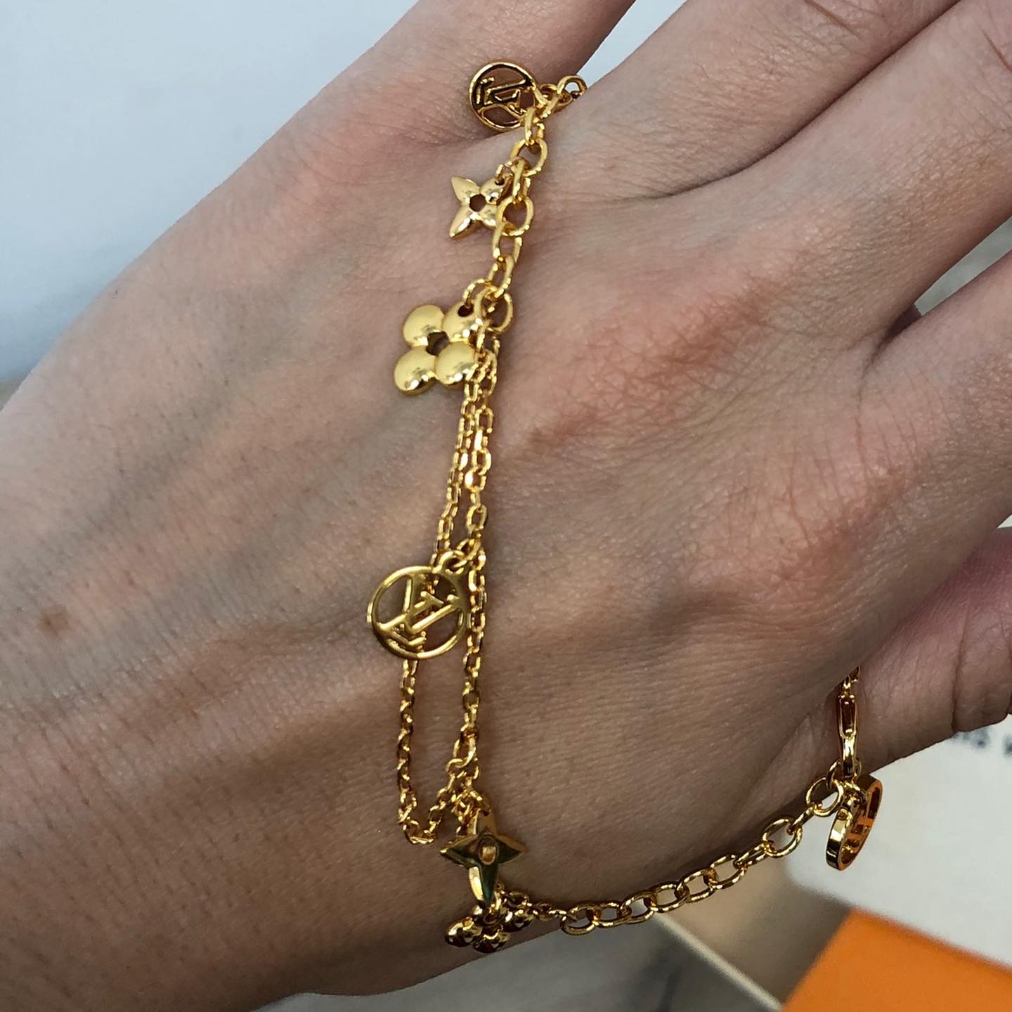 Изысканный браслет Louis Vuitton LUX-34876 в золотом цвете подчеркнет элегантность любого образа. Это утонченное украшение, выполненное в классическом стиле, станет прекрасным дополнением к вечернему или повседневному наряду. Детали в виде знаменитых монограмм бренда и миниатюрных цветов придают браслету неповторимый шарм и узнаваемость.