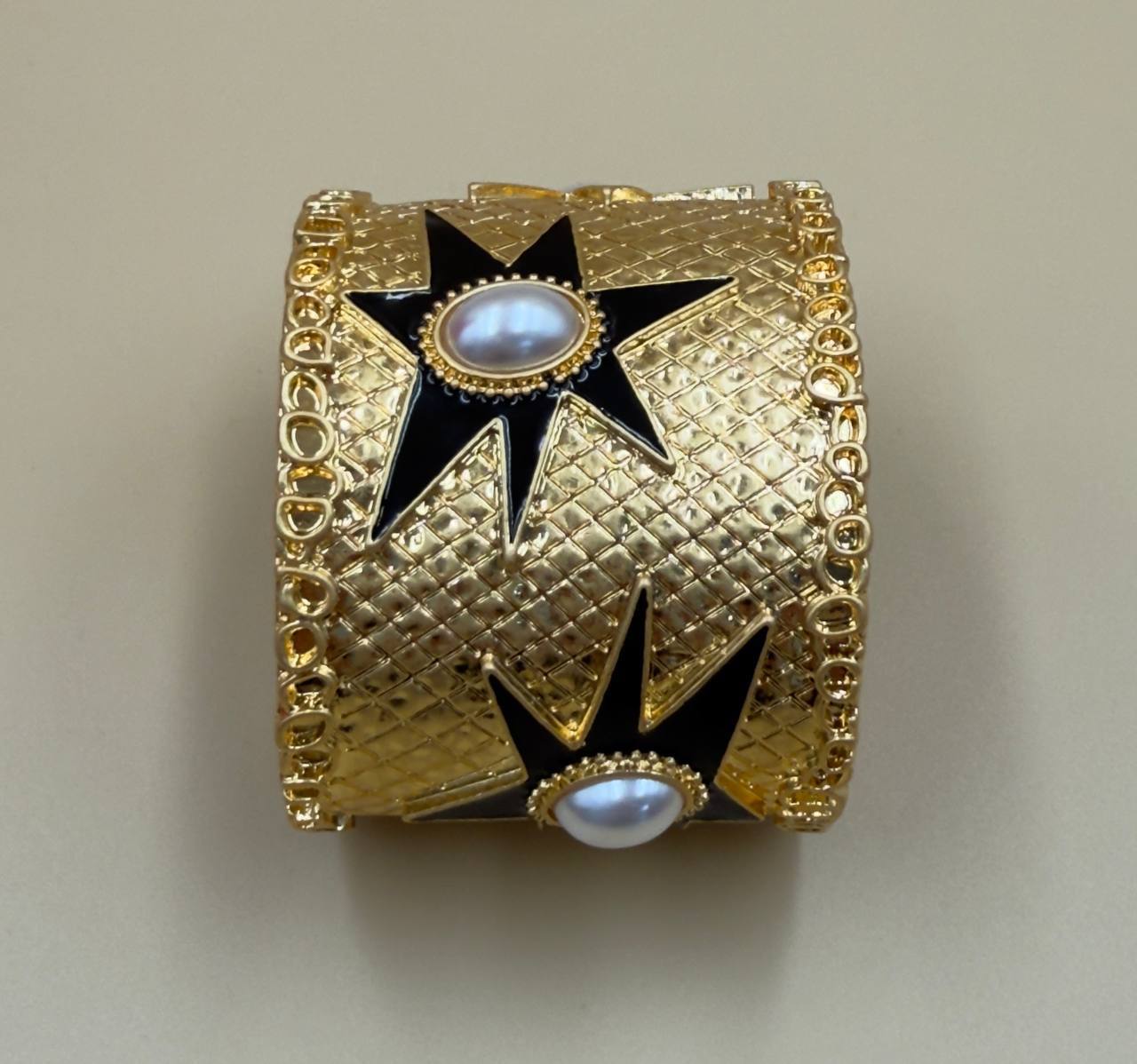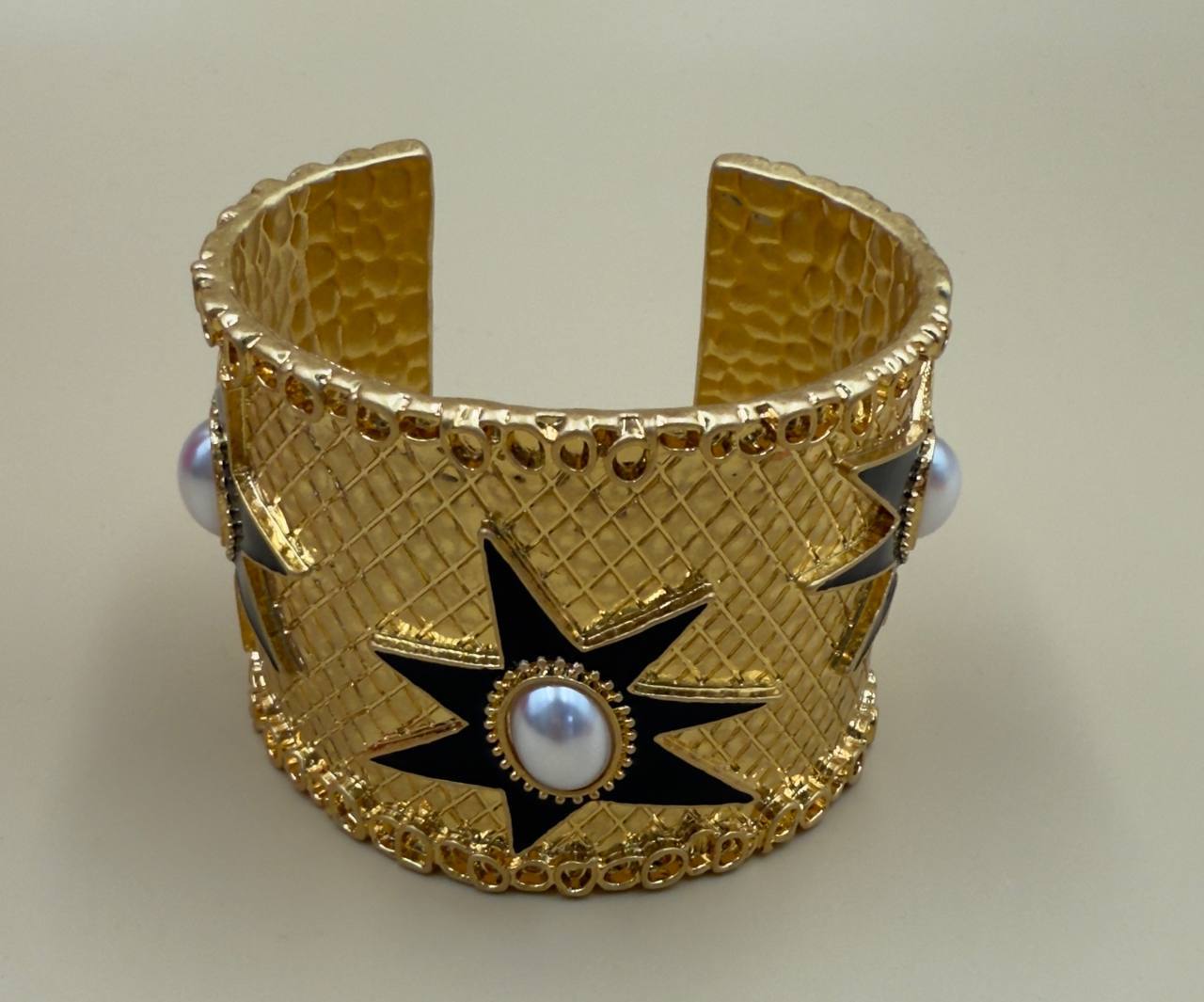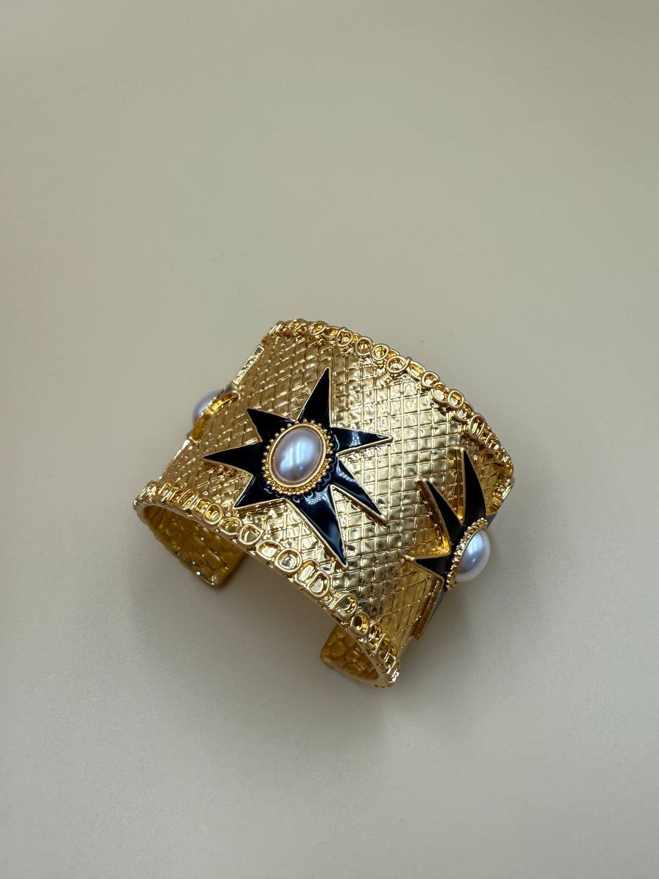 Браслет Schiaparelli LUX-118627 представляет собой выразительное украшение в стиле высокой моды. Браслет имеет золотистый цвет с декоративными элементами в виде звезд с черной эмалью и жемчужными вставками. Он добавит акцент в любой образ, будь то повседневный или вечерний.