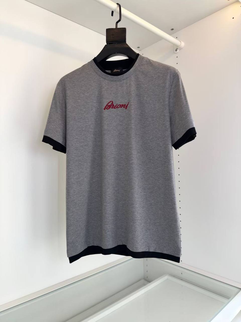Футболка Brioni LUX-117440 – это стильная футболка классического кроя от известного бренда. Серая футболка с контрастными черными манжетами и воротником выглядит элегантно и современно. На груди вышит логотип Brioni красного цвета, что добавляет изысканности.