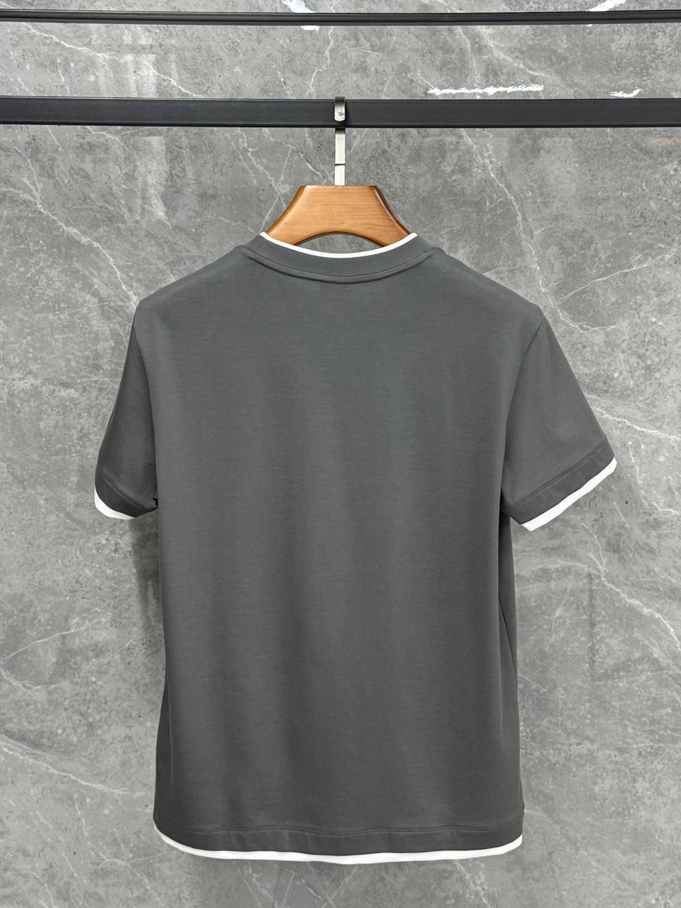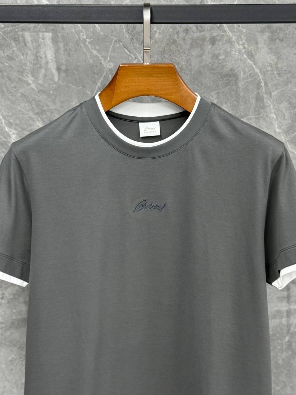 Футболка Brioni LUX-118126 — это классическая футболка в современном стиле. Основной цвет — серый, с белыми контрастными деталями на воротнике и рукавах. На груди расположен логотип бренда.