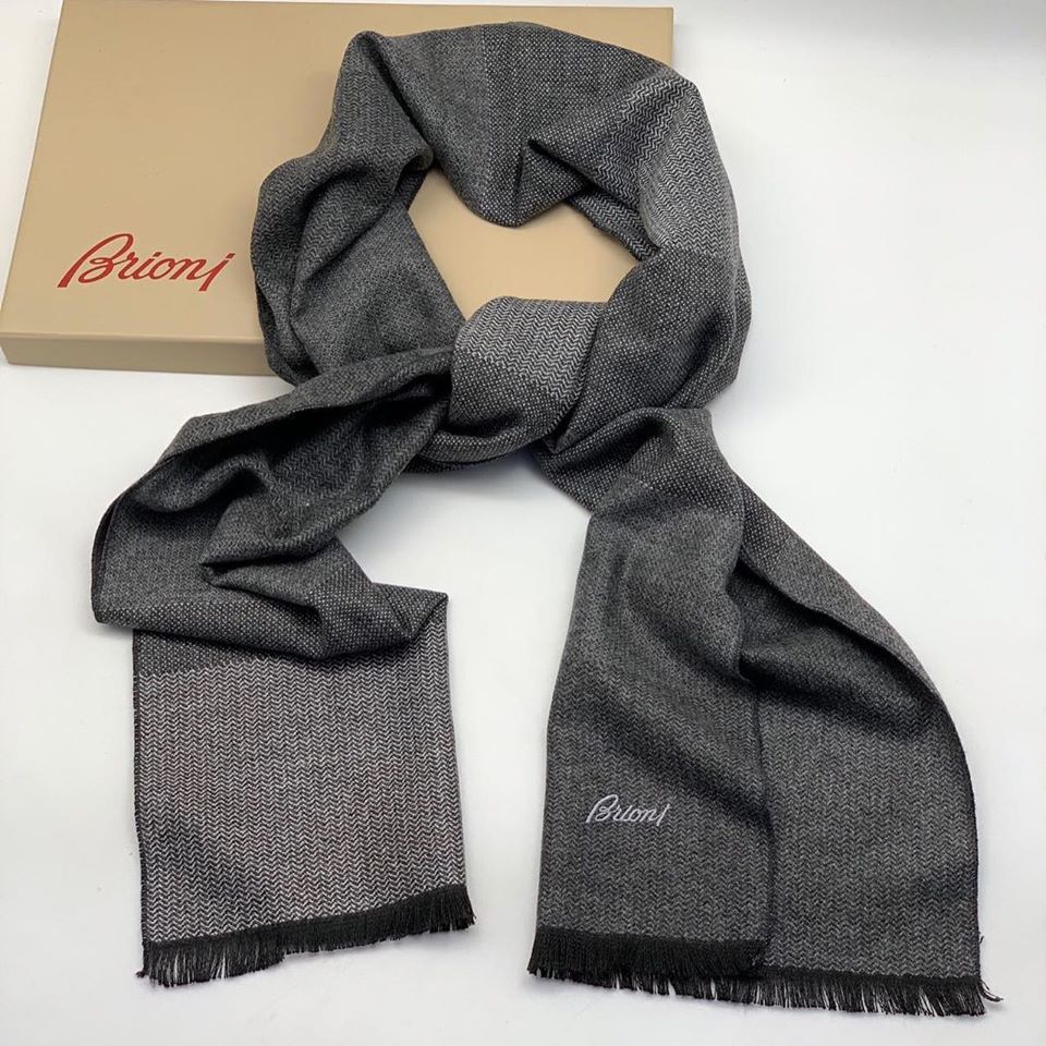 Шарф Brioni LUX-25665 представляет собой элегантный мужской аксессуар, выполненный в классическом стиле. Его универсальный серый цвет и тонкий узор "елочка" делают его идеальным дополнением к различным образам, от деловых до повседневных. Аккуратная вышивка с логотипом бренда подчеркивает статусность изделия.
