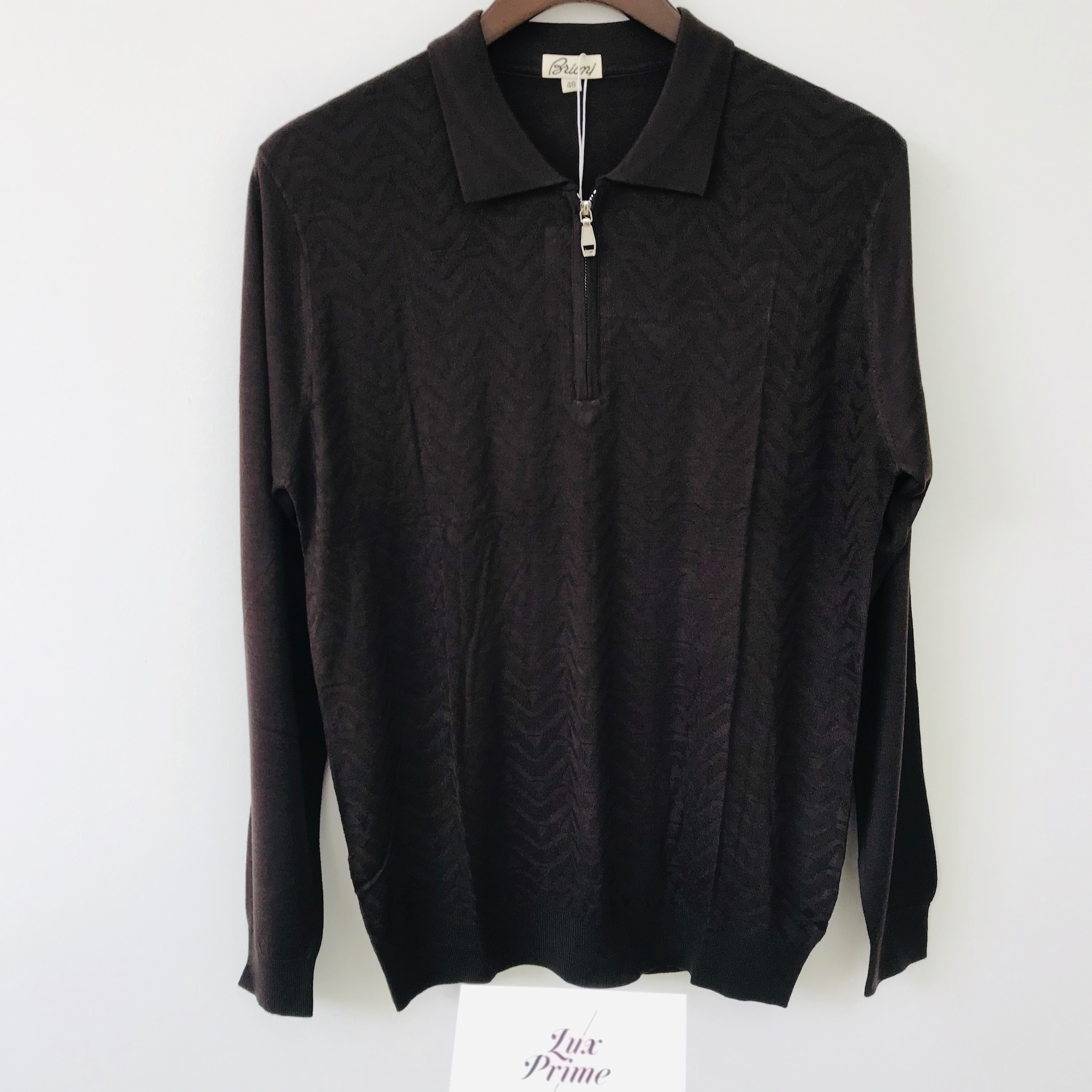 Свитшот Brioni LUX-17516 представляет собой элегантный выбор для современного мужчины, сочетающий классический крой с утонченным дизайном. Изделие выполнено в темно-коричневом цвете и украшено деликатным зигзагообразным узором, который придает ему текстуру и глубину. Отложной воротник и застежка на молнию добавляют спортивный акцент, делая этот свитшот универсальным элементом гардероба.