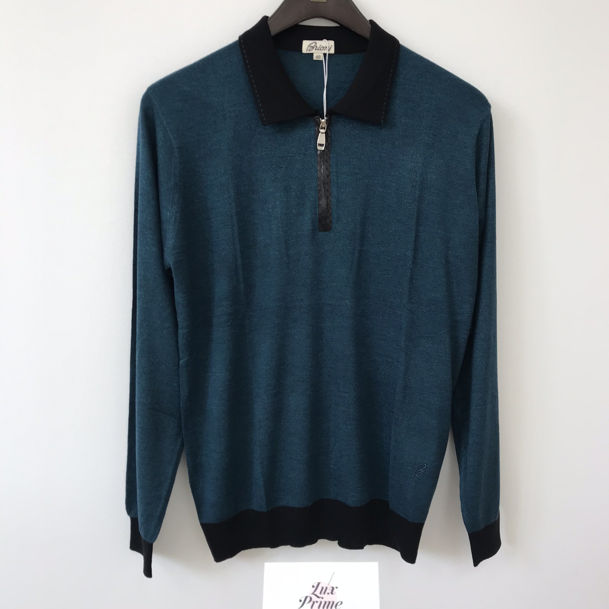 Этот свитшот Brioni LUX-17520 — элегантный выбор для современного мужчины. Он выполнен в глубоком сине-зеленом цвете и дополнен контрастным черным воротником-поло и манжетами. Декоративная молния добавляет изделию стильный акцент. Свитшот подходит как для повседневного, так и для более формального гардероба.