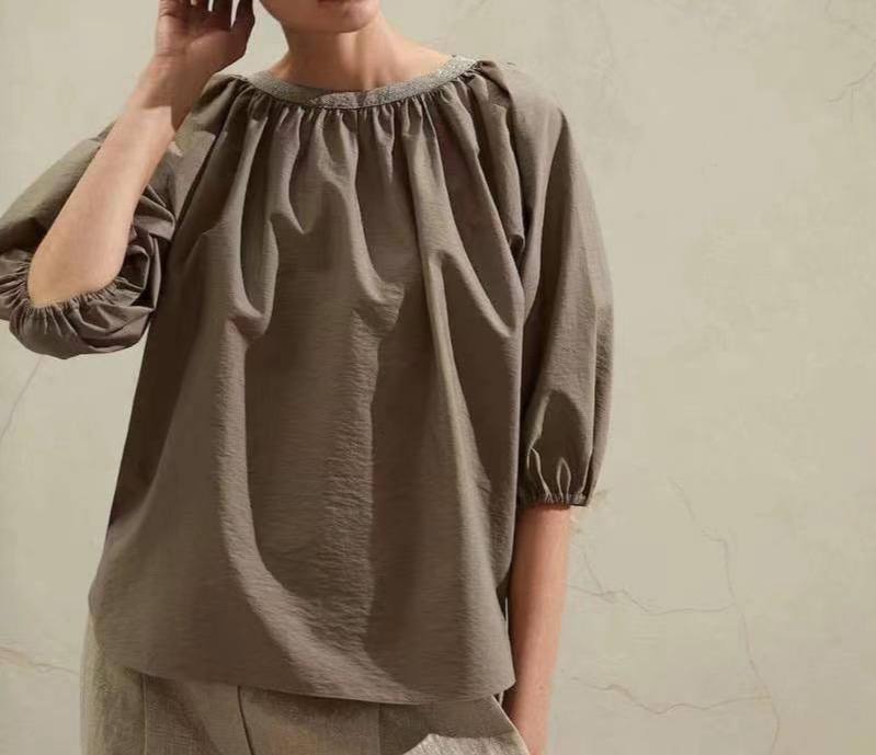 Эта блузка Brunello Cucinelli LUX-50240 представляет собой элегантное изделие в стиле casual chic. Свободный крой и объемные рукава создают расслабленный, но изысканный силуэт. Декоративная отделка по вырезу горловины добавляет изделию утонченности.