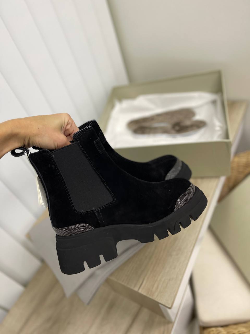 Ботинки Brunello Cucinelli LUX-79059 — это стильные ботинки-челси черного цвета с массивной подошвой. Они выполнены из замши, которая придает им элегантный и роскошный вид. Дизайн ботинок позволяет сочетать их с различными образами, от повседневных до более формальных.