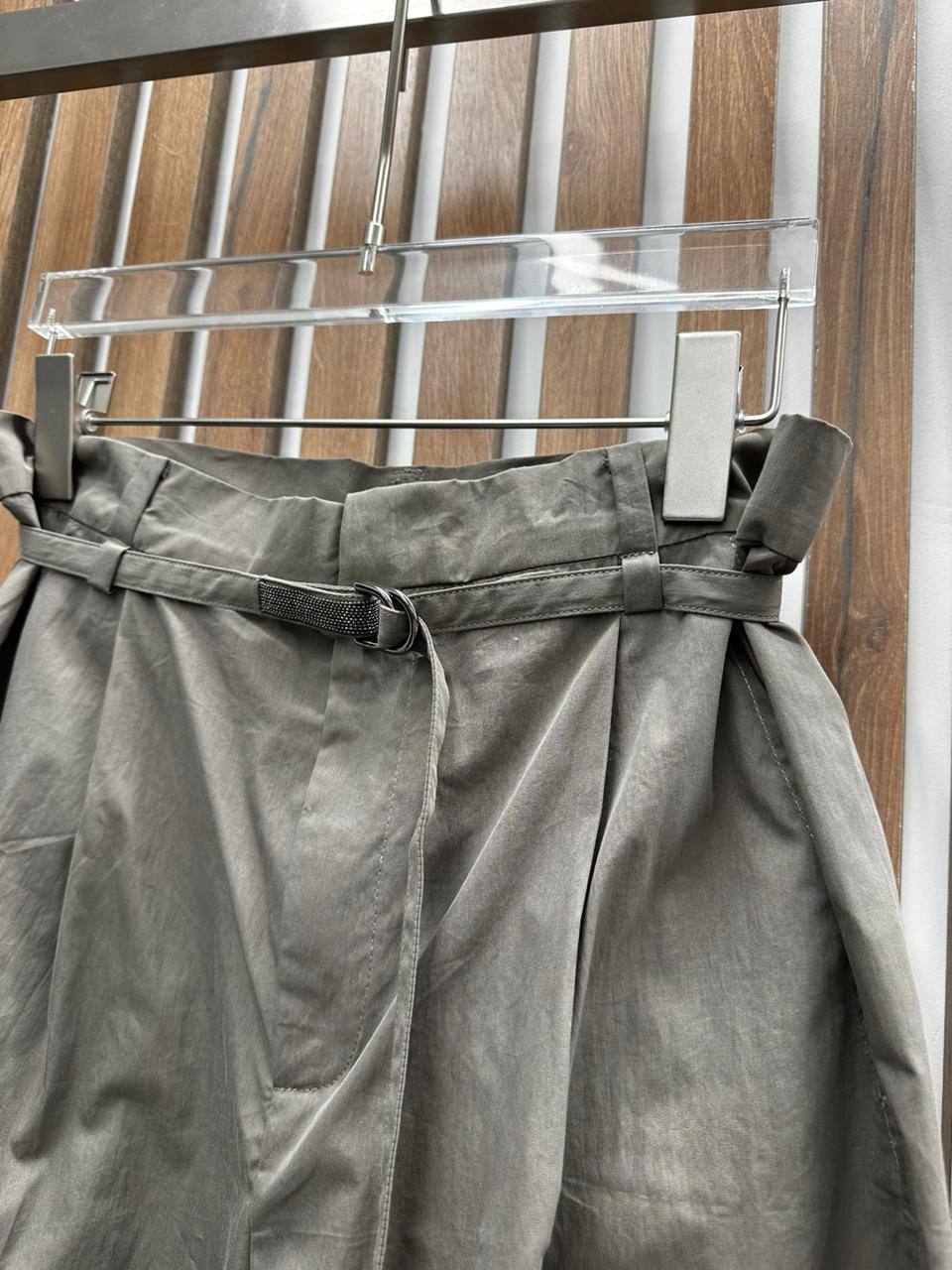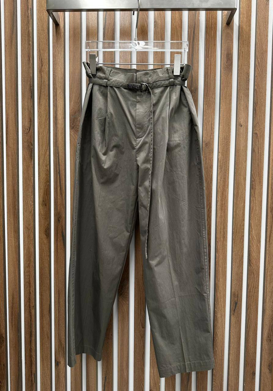 Брюки Brunello Cucinelli LUX-90665 — это элегантные брюки свободного кроя, выполненные в нейтральном серо-зеленом оттенке. Брюки имеют высокую посадку, широкий пояс с пряжкой и складки спереди, придающие им современный и стильный вид. Идеально подходят для создания как повседневных, так и более формальных образов.