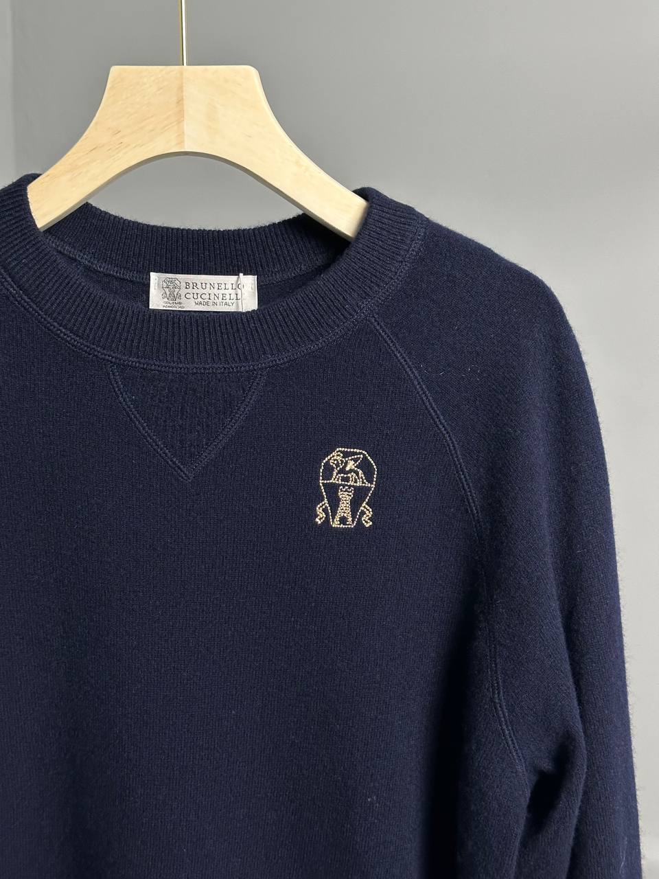 Джемпер Brunello Cucinelli LUX-113285 - это стильный предмет гардероба, сочетающий в себе элегантность и комфорт. Джемпер темно-синего цвета с круглым вырезом и логотипом бренда, выполненным в нейтральных тонах. Этот джемпер идеально подходит для создания как повседневных, так и более формальных образов.