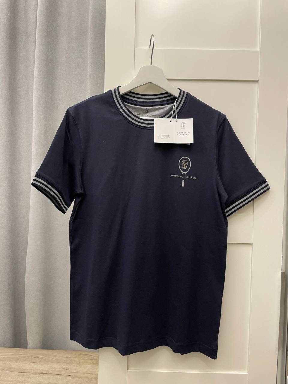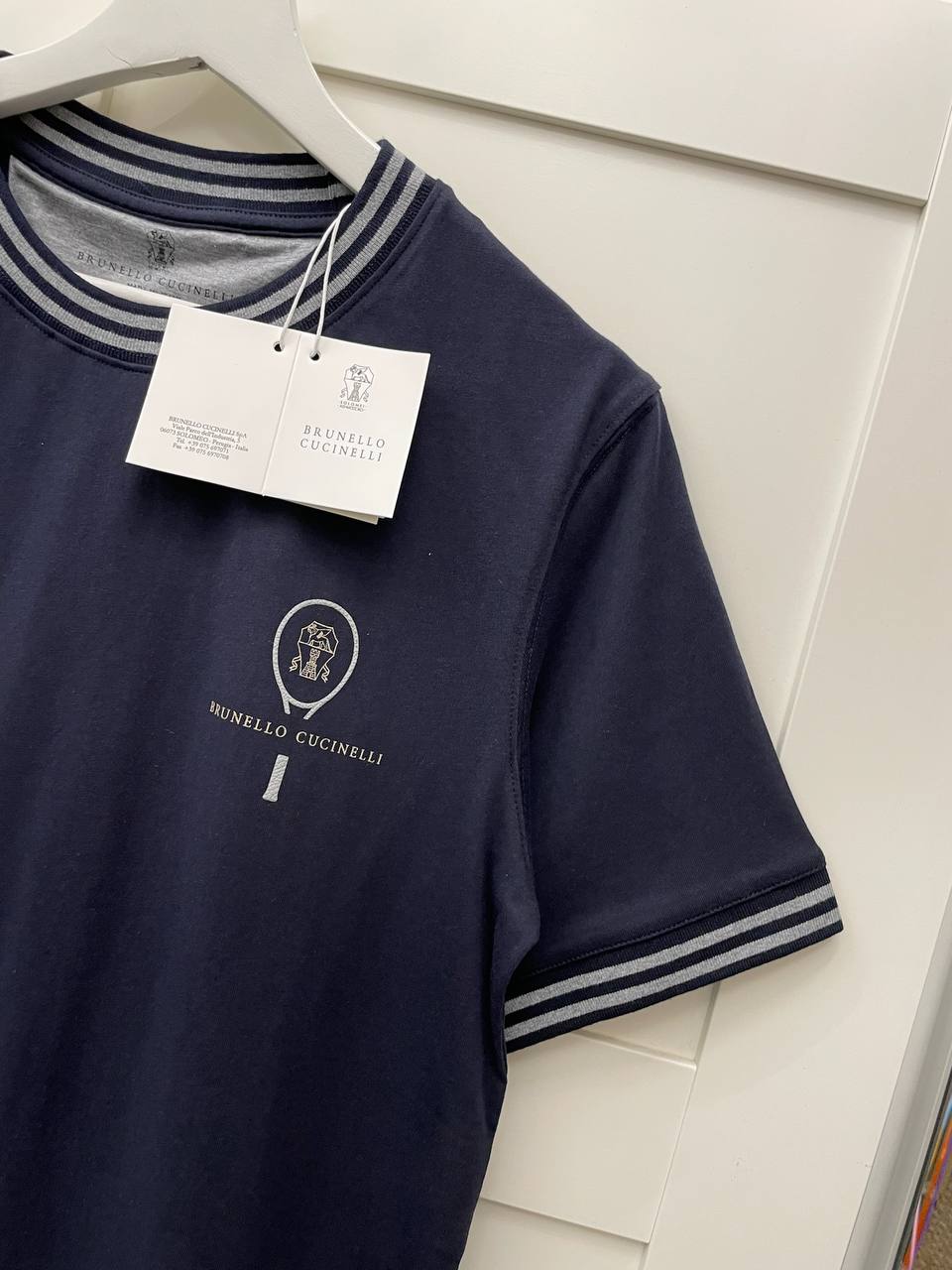 Футболка Brunello Cucinelli LUX-103746 — это элегантная футболка в спортивном стиле темно-синего цвета с контрастными серыми полосками на манжетах и воротнике. Футболка имеет классический крой и логотип бренда на груди. Она предназначена для повседневной носки, идеально сочетается с джинсами или спортивными брюками.