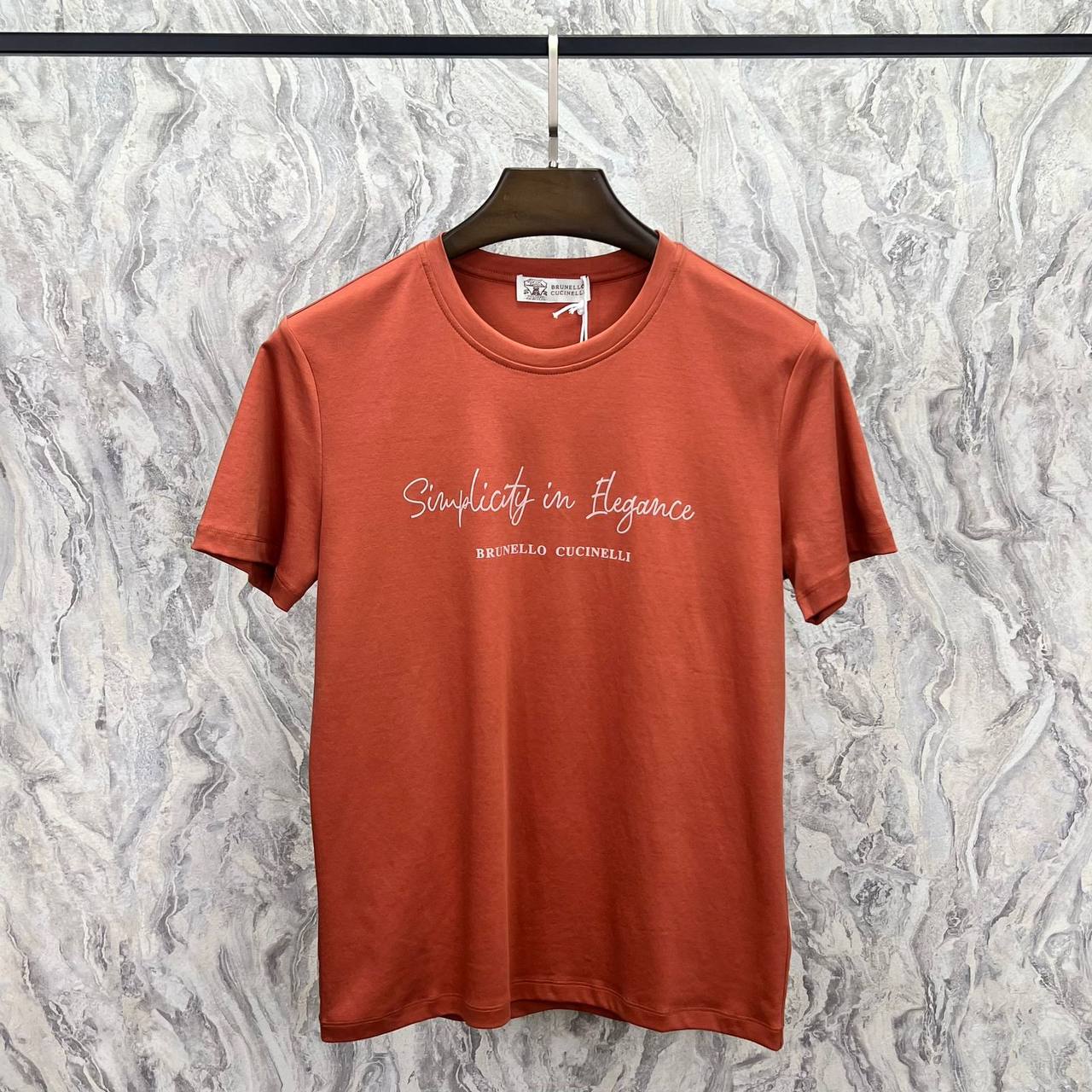 Футболка Brunello Cucinelli (артикул LUX-88254) — это стильный предмет гардероба, выполненный в классическом стиле. Она выполнена в терракотовом цвете с надписью «Simplicity in Elegance» спереди, что добавляет изделию элегантности. Футболка идеально подходит для повседневного использования и может сочетаться с различными элементами гардероба.