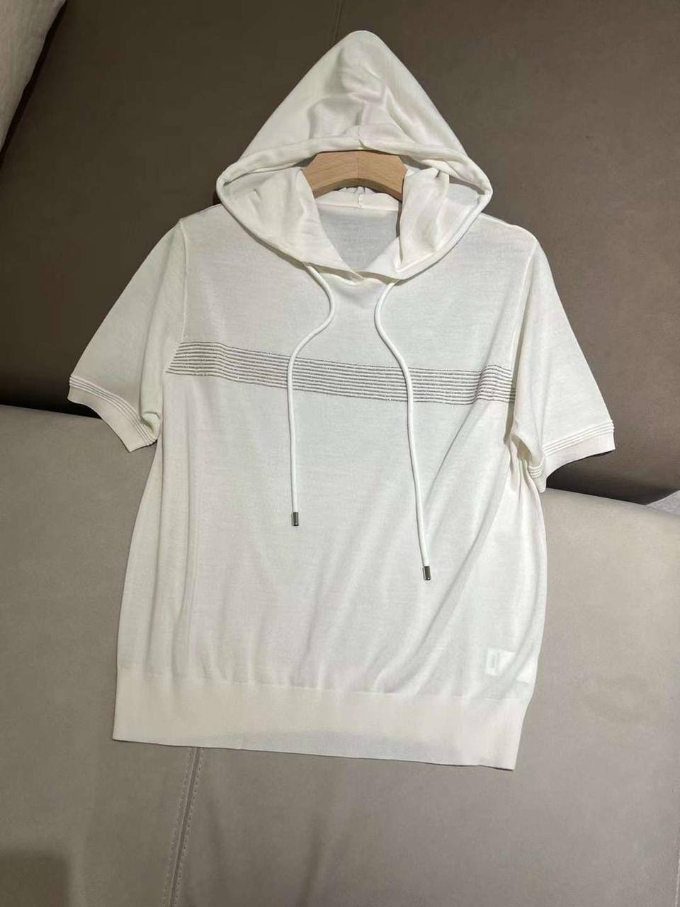 Футболка Brunello Cucinelli LUX-88650 – это воплощение элегантности и комфорта. Эта модель выполнена в белом цвете с капюшоном и короткими рукавами. Дизайн футболки дополнен горизонтальными полосами на груди, придающими ей изысканный вид.