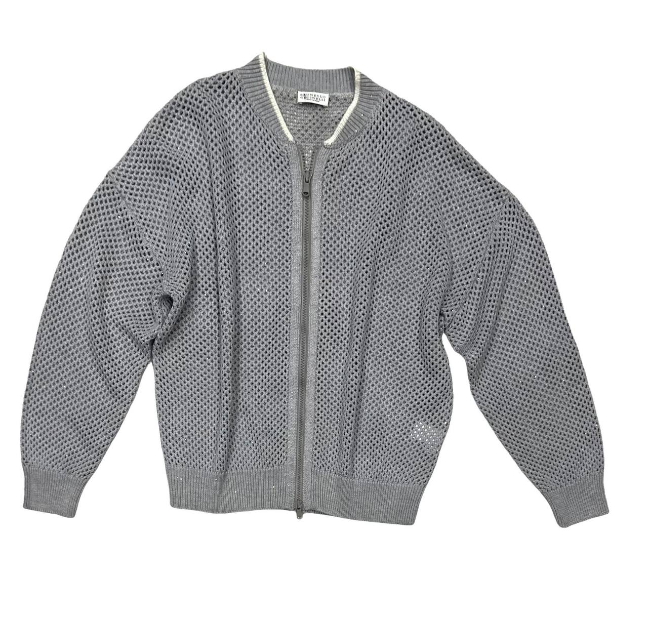 Кофта Brunello Cucinelli LUX-69829 – это стильная кофта серого цвета, выполненная в сетчатой технике. Кофта имеет классический силуэт с воротником-стойкой, застегивается на молнию. Отлично подойдет для создания повседневных образов.