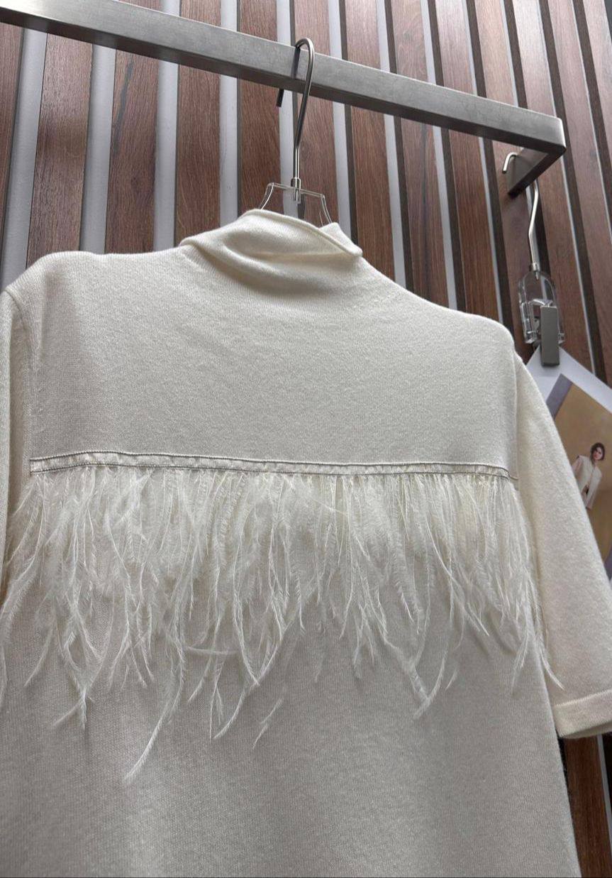 Кофта Brunello Cucinelli LUX-111353 — это изысканный предмет гардероба, сочетающий в себе элегантность и комфорт. Кофта выполнена в кремовом оттенке, имеет короткий рукав и высокий воротник-стойку. Декоративная отделка из перьев добавляет изделию неповторимый шарм.