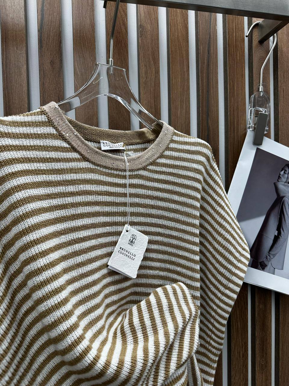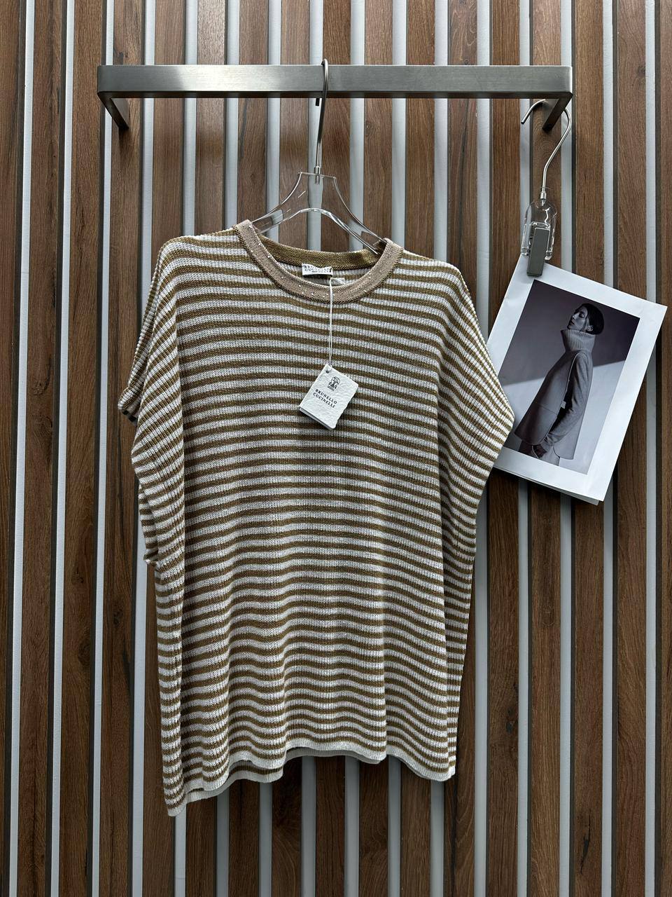 Кофта Brunello Cucinelli LUX-117380 — это стильный предмет гардероба, выполненный в полосатом дизайне. Кофта выполнена в бежевом и коричневом цвете, что делает ее универсальной для различных образов. Этот предмет одежды подходит для повседневной носки и хорошо сочетается с различными элементами гардероба.