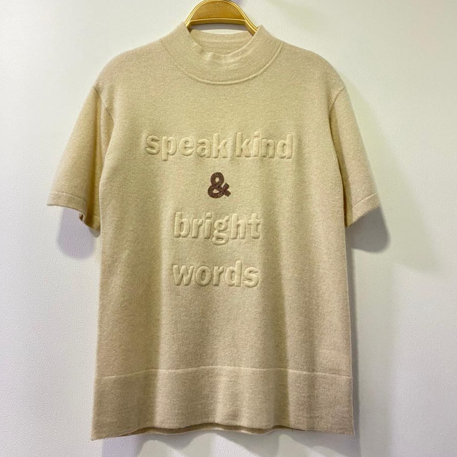 Женская кофта Brunello Cucinelli LUX-34223 выполнена в стиле casual, сочетая в себе элегантность и комфорт. Кофта имеет короткие рукава и высокий воротник, украшена объемной надписью "speak kind & bright words", выполненной в тон ткани. Это универсальный предмет гардероба, который легко впишется как в повседневный, так и в более утонченный образ.