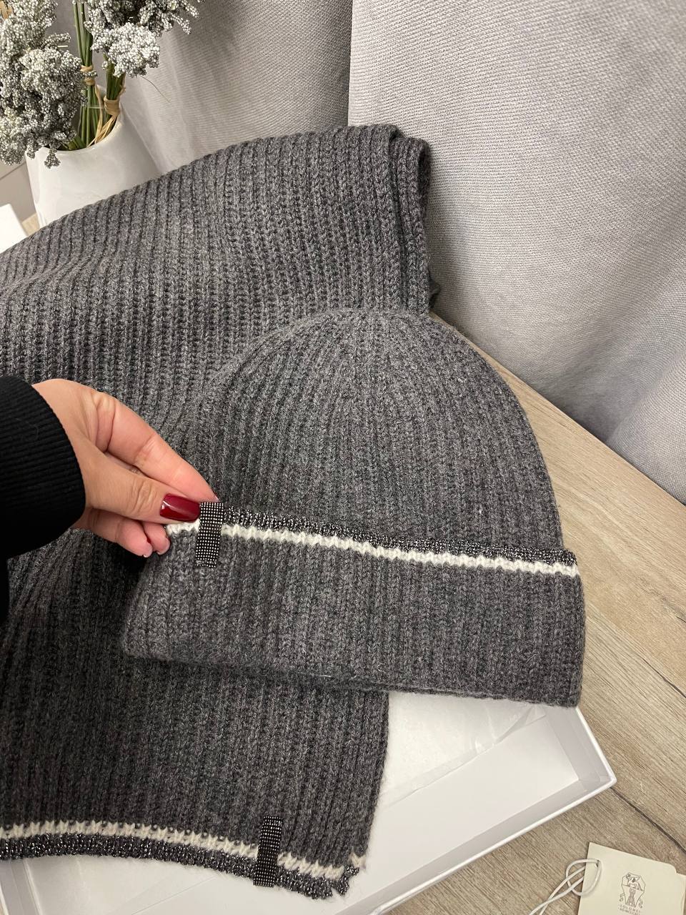 Комплект Brunello Cucinelli LUX-114383 - это стильный зимний аксессуар, который идеально дополнит ваш гардероб. Комплект включает в себя шапку и шарф, выполненные в едином стиле и цветовой гамме. Серый цвет и мягкая текстура материала делают его универсальным и подходящим для различных образов.