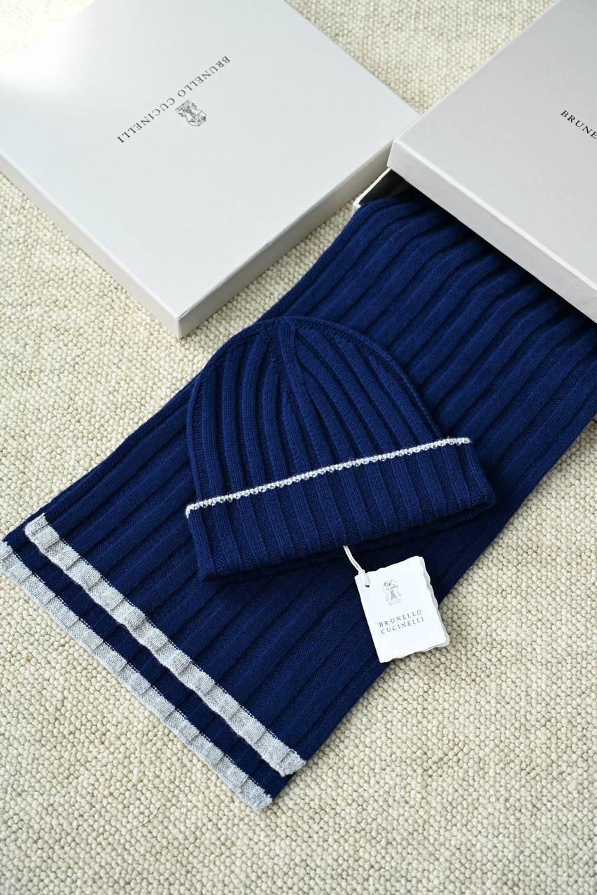 Комплект Brunello Cucinelli LUX-127887 - это стильный набор из шапки и шарфа, выполненный в темно-синем цвете с декоративными полосками. Такой комплект станет прекрасным дополнением к вашему гардеробу, обеспечивая тепло и комфорт в холодное время года.