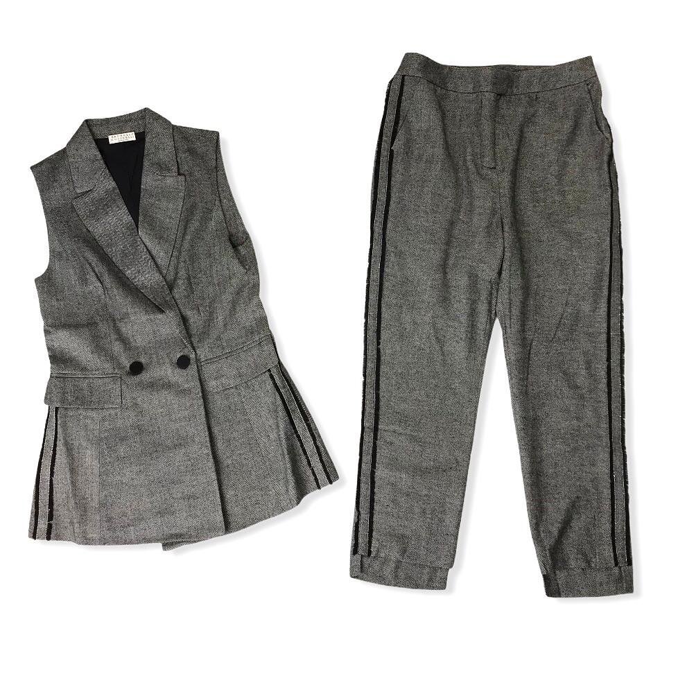Этот элегантный костюм Brunello Cucinelli LUX-47602, состоящий из жилета и брюк, воплощает в себе современный стиль и утонченность. Серый меланжевый цвет и контрастные черные лампасы по бокам брюк и на подоле жилета придают образу динамичность. Костюм идеально подойдет для создания стильных повседневных и деловых образов, подчеркивая индивидуальность.