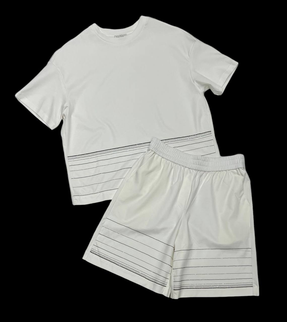 Элегантный мужской костюм Brunello Cucinelli LUX-69181 представляет собой идеальное сочетание стиля и комфорта. Костюм выполнен в современном стиле, подчеркивающем изысканный вкус владельца. Лаконичный дизайн с ненавязчивым принтом в виде тонких горизонтальных линий на футболке и шортах делает его универсальным для различных летних образов.