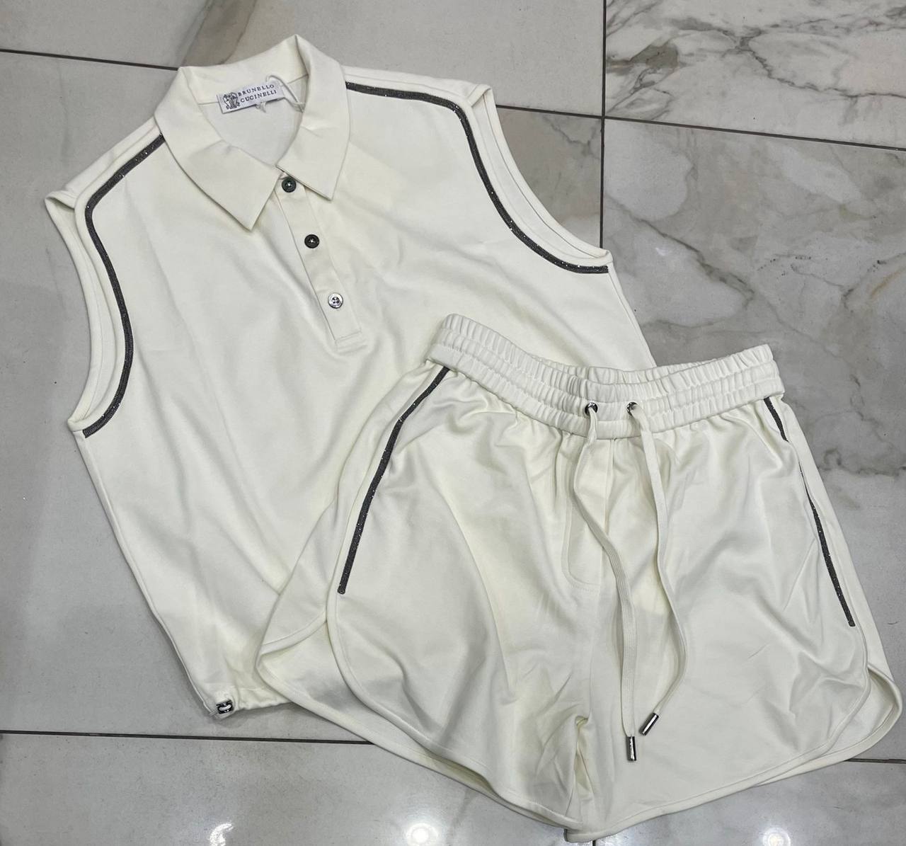 Костюм Brunello Cucinelli LUX-70630 представляет собой стильный комплект из коллекции известного бренда. Комплект выполнен в светлом оттенке и имеет спортивный стиль. Он отлично подойдет для создания повседневных образов в теплое время года.