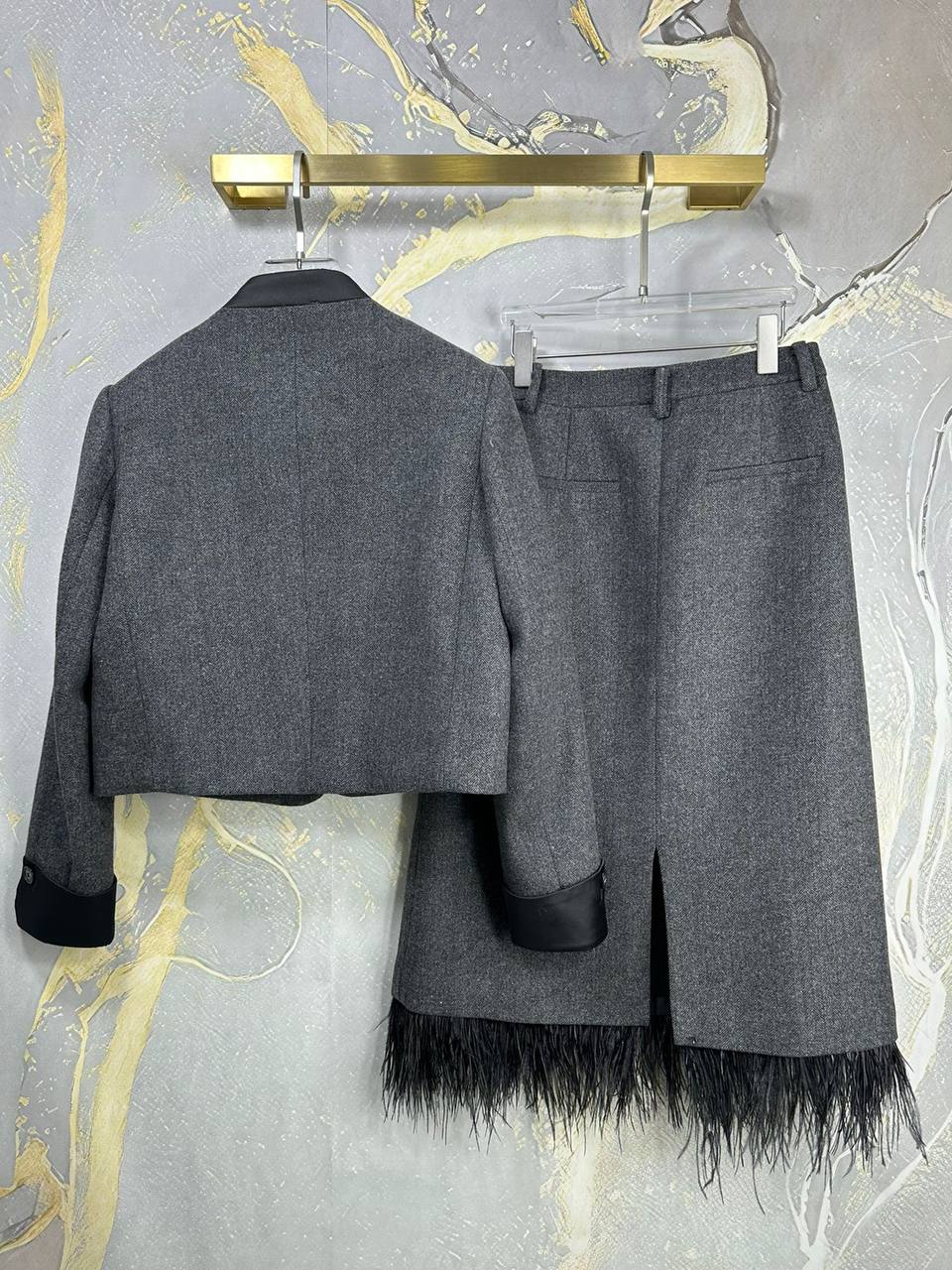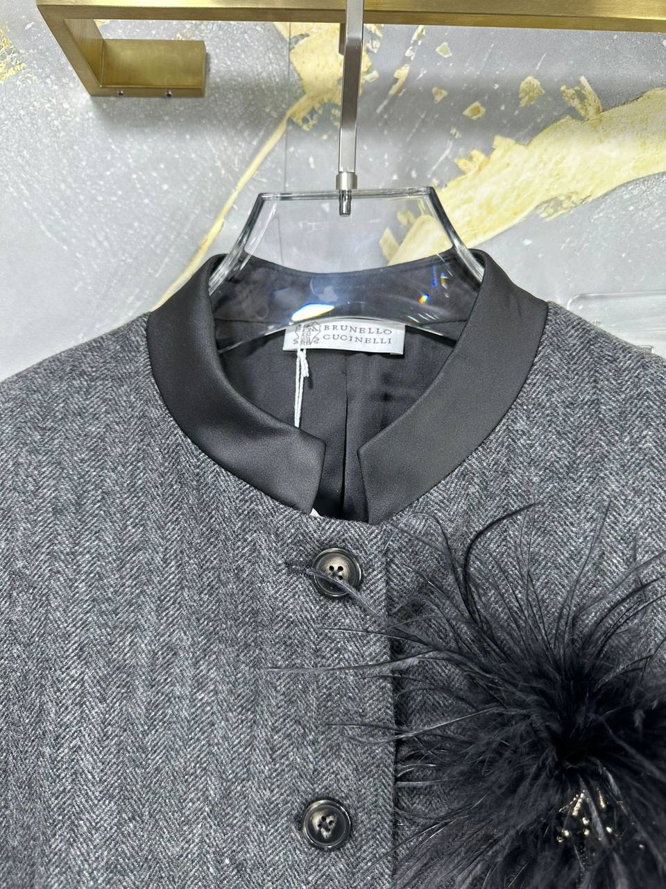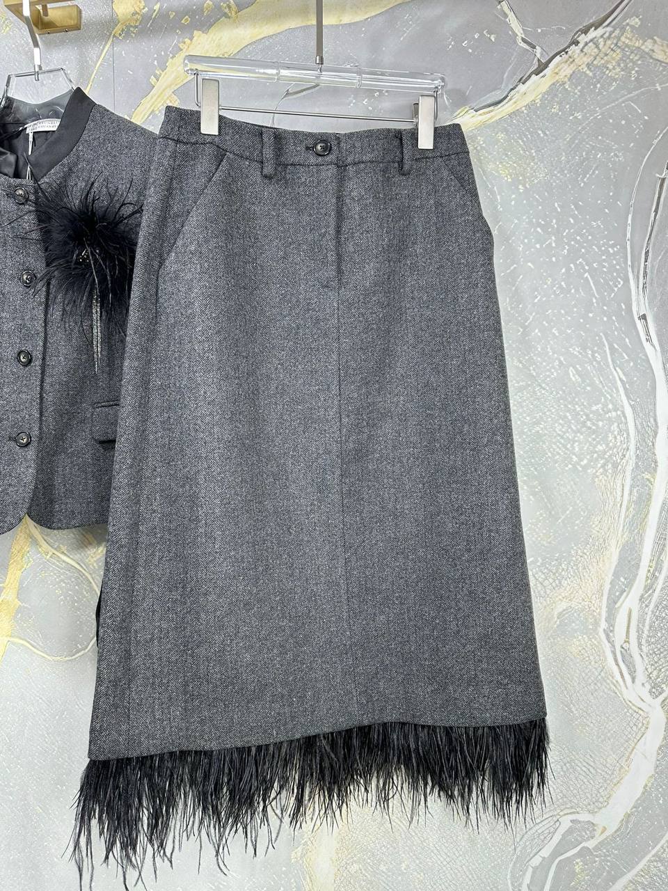 Костюм Brunello Cucinelli LUX-111271 представляет собой изысканный ансамбль в элегантном стиле. Серый костюм включает в себя жакет с аккуратным воротником-стойкой, дополненный декоративным элементом в виде пера, и юбку-карандаш. Комплект идеально подходит для создания утонченного образа, подчеркивая безупречный вкус и стиль.