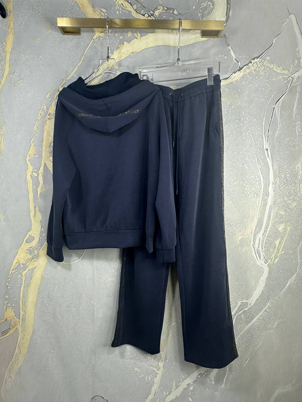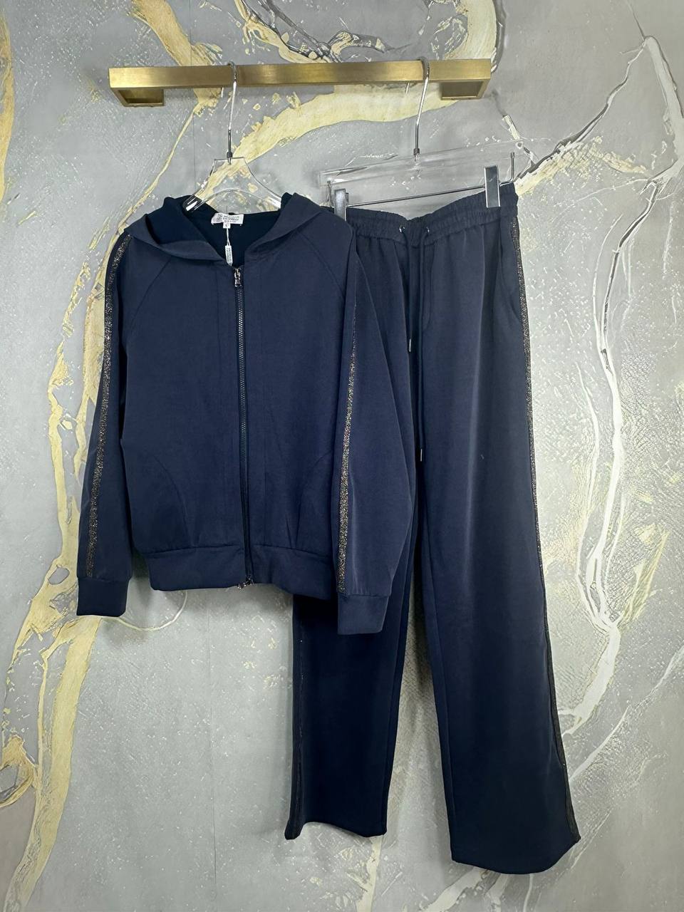 Костюм Brunello Cucinelli LUX-111694 представляет собой стильный спортивный костюм из мягкой ткани. Комплект состоит из худи на молнии с капюшоном и брюк прямого кроя. Темно-синий цвет и блестящие полоски по бокам придают костюму элегантность и подойдут для создания повседневных образов.
