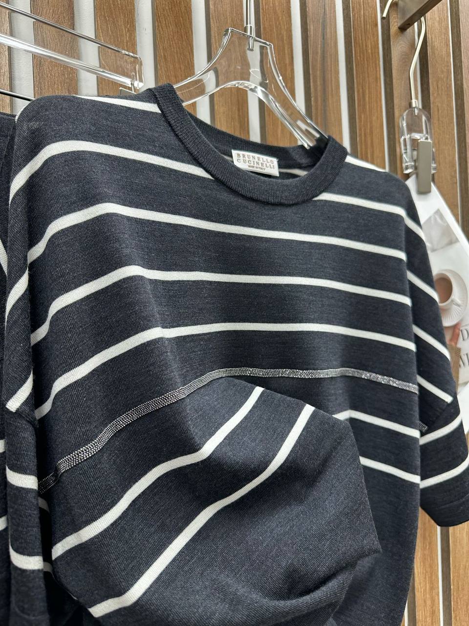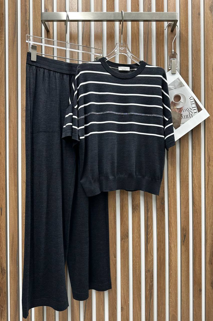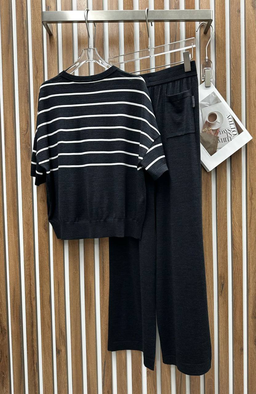 Костюм Brunello Cucinelli LUX-116736 представляет собой стильный комплект, состоящий из топа и брюк. Комплект выполнен в классическом стиле с горизонтальными полосами на топе и сплошным дизайном брюк, что придает ему элегантный и современный вид. Черный цвет делает его универсальным для различных поводов.