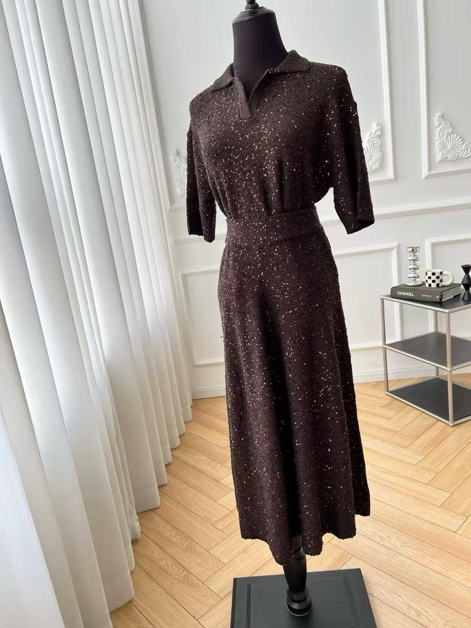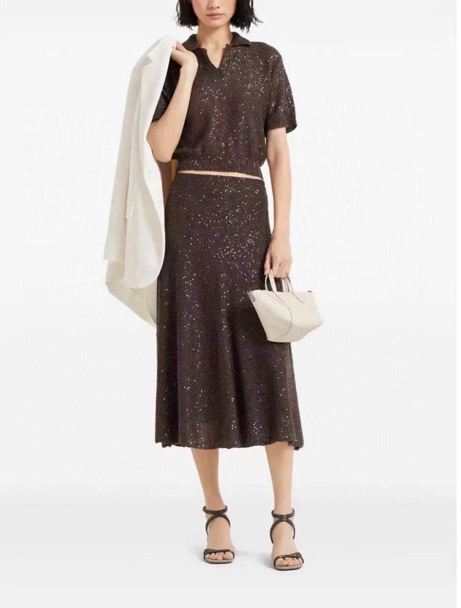 Костюм Brunello Cucinelli LUX-116901 представляет собой элегантное трикотажное платье с короткими рукавами и воротником поло, выполненное в коричневом цвете с блестящим декором. Этот костюм идеально подходит для создания утонченного образа, сочетая в себе комфорт и изысканность. Его можно носить как на повседневные мероприятия, так и на более торжественные случаи.