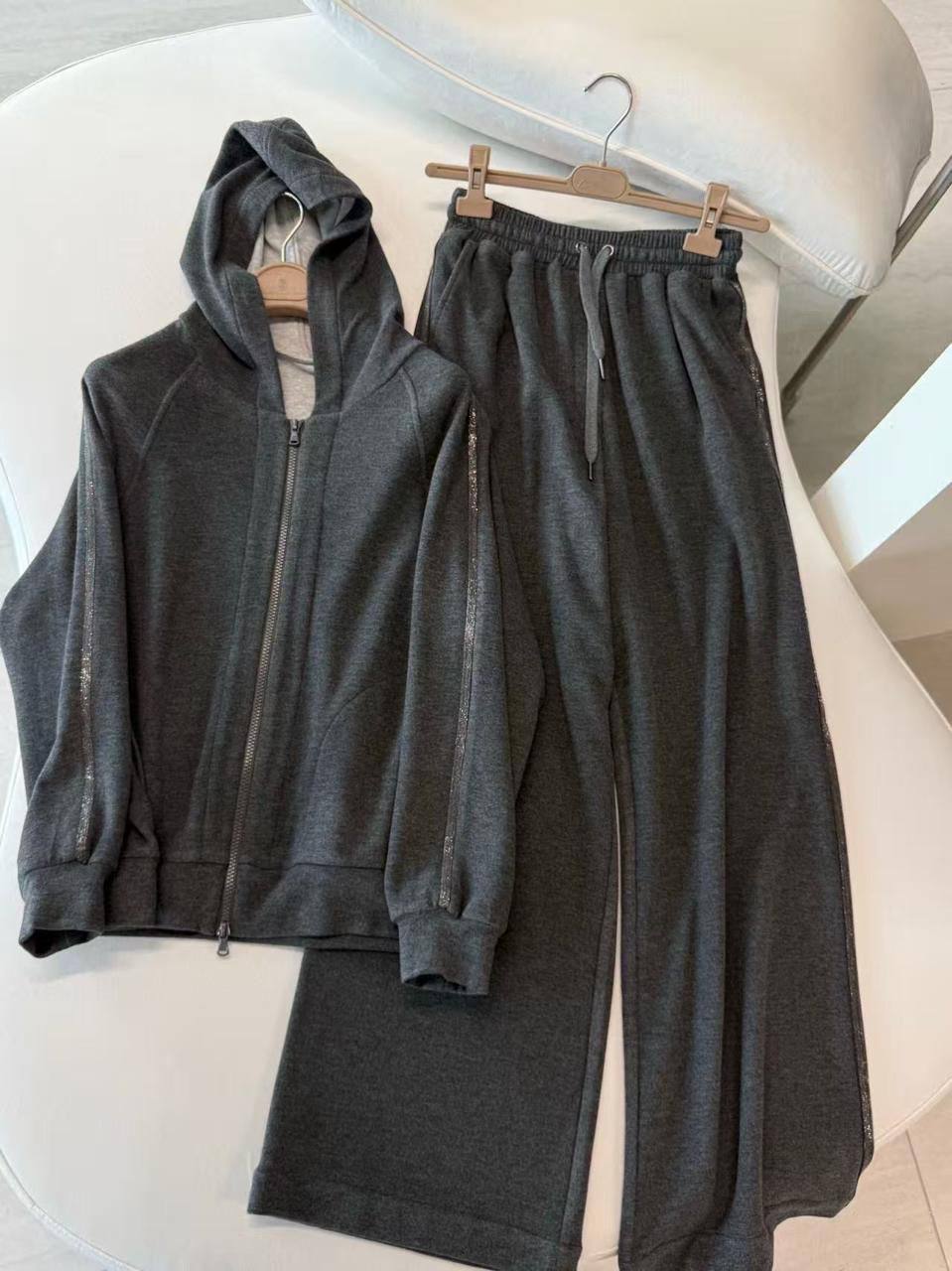 На фотографии представлен стильный костюм от Brunello Cucinelli. Это комфортный и элегантный комплект в спортивном стиле, состоящий из толстовки с капюшоном на молнии и широких брюк.