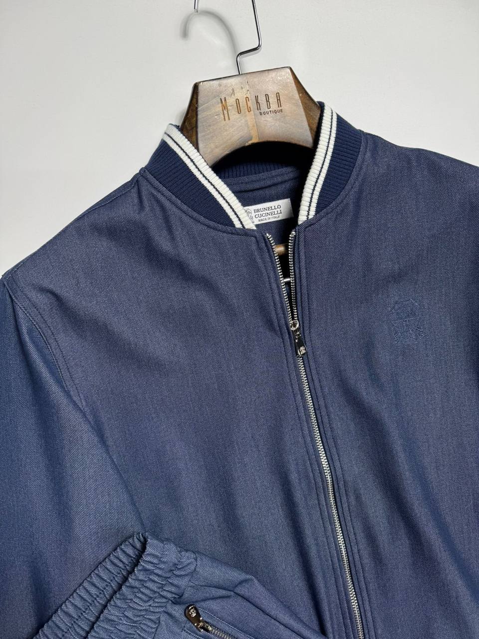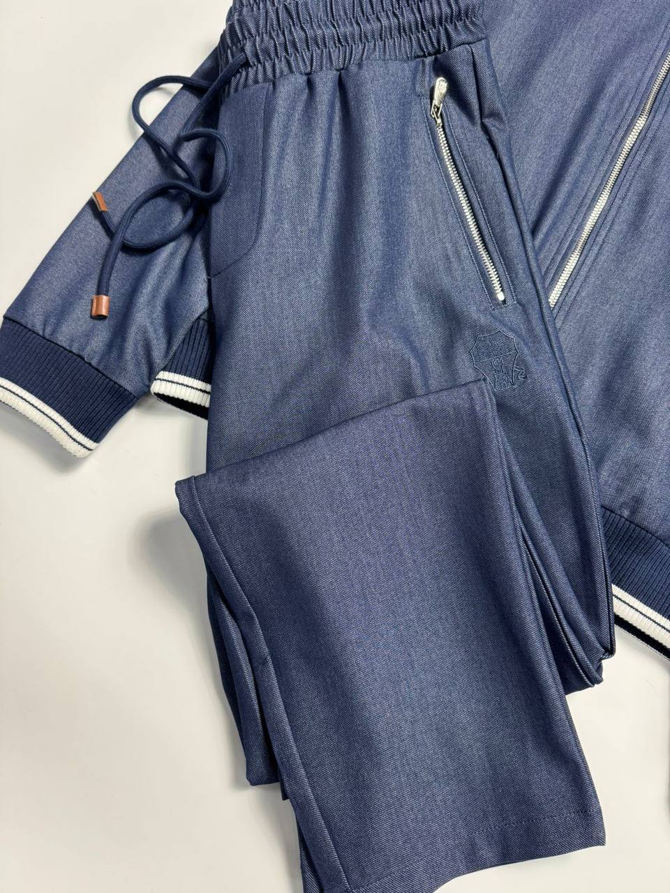 Костюм мужской Brunello Cucinelli LUX-116168 представляет собой стильный комплект в спортивном стиле. Комплект включает в себя куртку-бомбер и брюки, выполненные в темно-синем цвете. Текстура ткани костюма выглядит мягкой и комфортной. Идеальный выбор для повседневного гардероба.