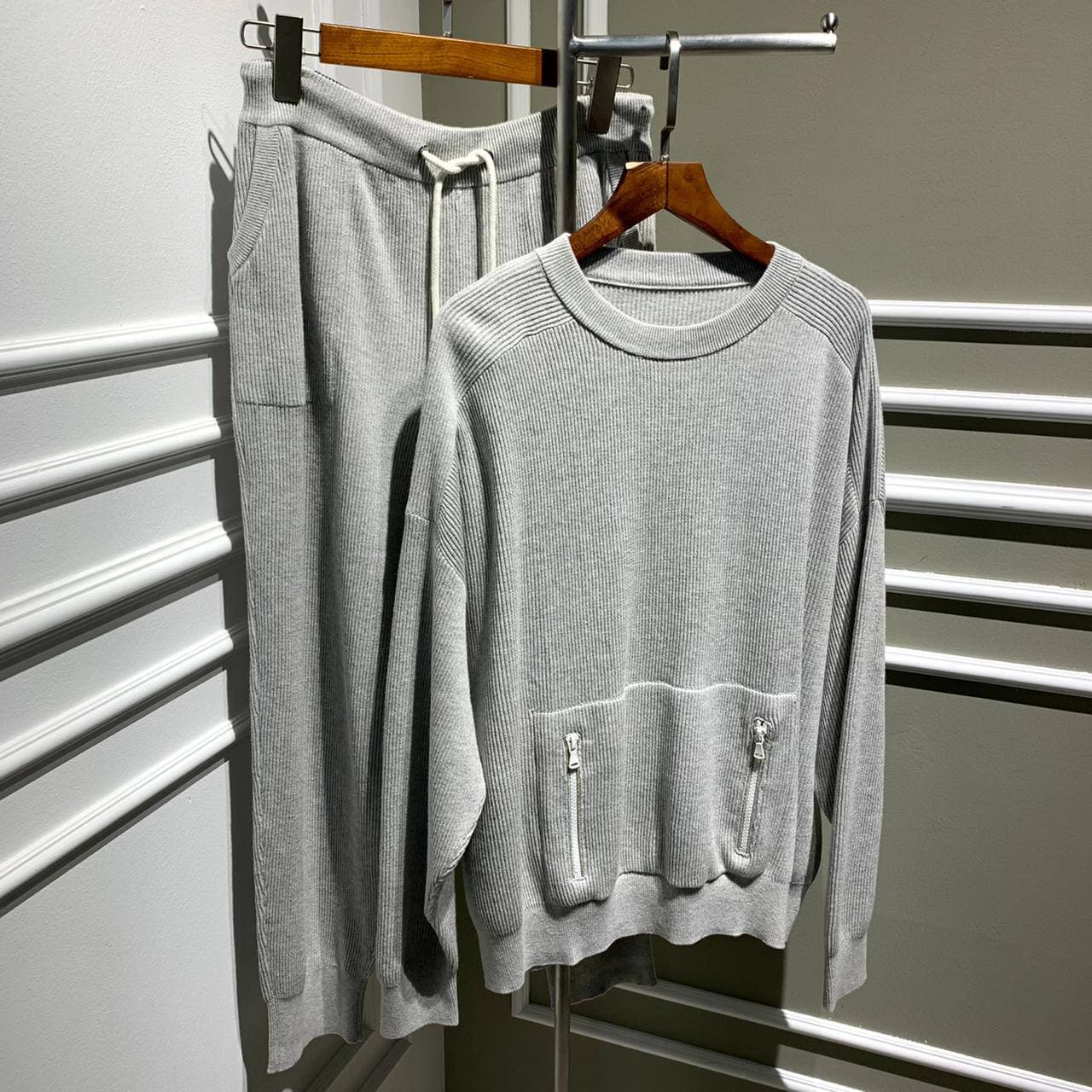 Спортивный костюм Brunello Cucinelli LUX-53845 представляет собой идеальное сочетание стиля и комфорта. Серый костюм выполнен из высококачественного трикотажа, состоящего из шерсти и кашемира, что придает ему роскошную мягкость и тепло. Комплект включает свободный джемпер с круглым вырезом и декоративными молниями на карманах, а также удобные брюки на кулиске.