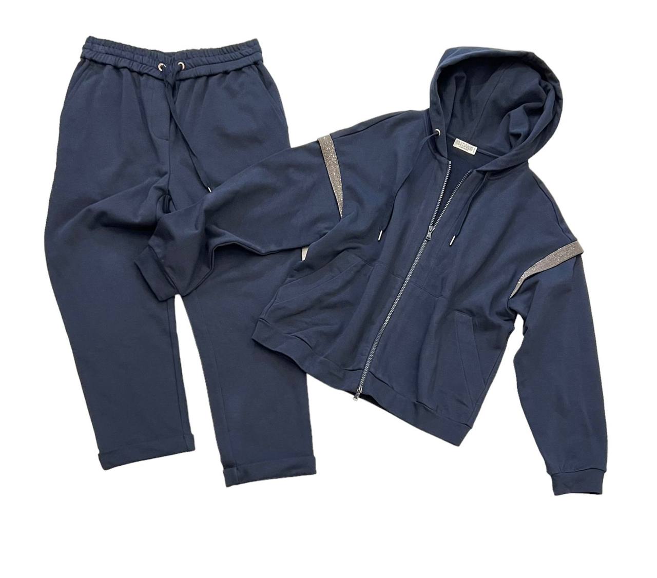 Костюм спортивный Brunello Cucinelli LUX-83739 — это воплощение элегантности и комфорта в спортивном стиле. Темно-синий костюм, состоящий из худи с капюшоном и спортивных брюк, отличается современным дизайном. Подойдёт для повседневной носки, создавая стильный образ.