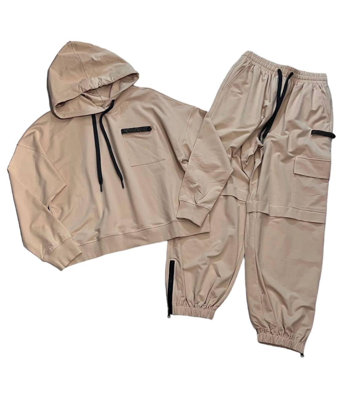 Костюм спортивный Brunello Cucinelli LUX-94434 представлен в спортивном стиле. Он выполнен в нейтральном бежевом цвете. Костюм состоит из худи с капюшоном и спортивных брюк. Он подходит для создания комфортных повседневных образов.