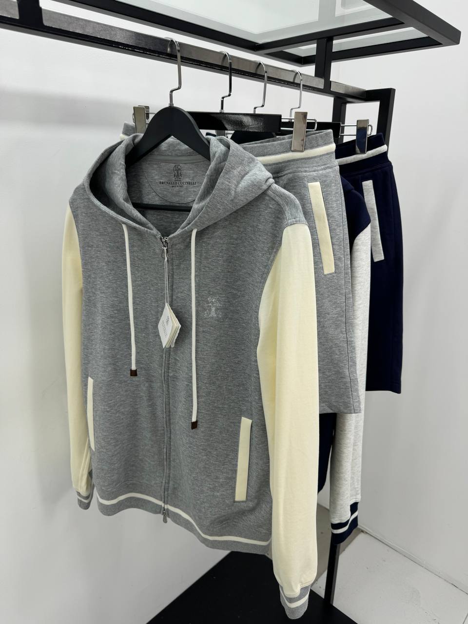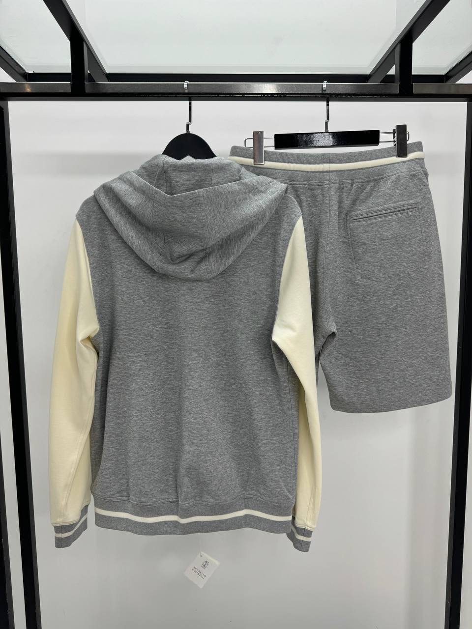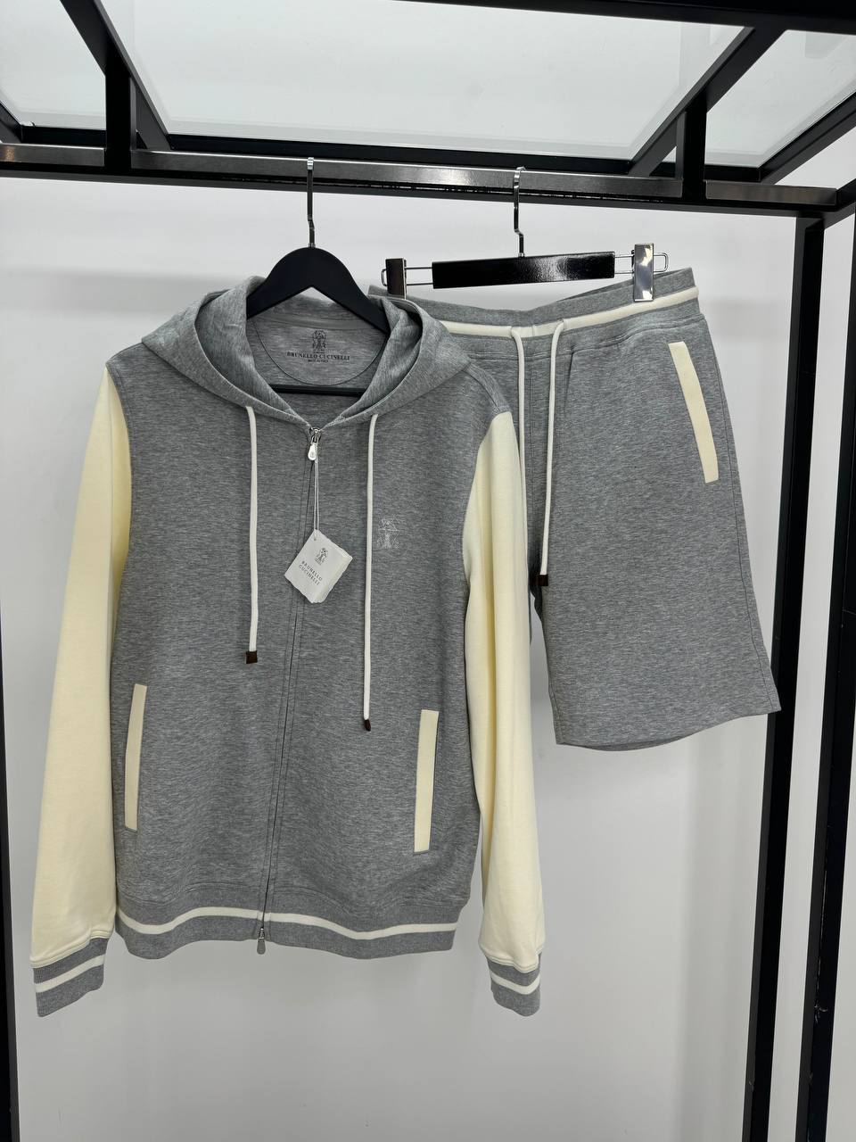 Костюм спортивный Brunello Cucinelli LUX-118439 — это стильный комплект, состоящий из худи с молнией и шорт. Спортивный костюм выполнен в сером цвете с кремовыми рукавами и отделкой, придающей ему элегантный вид. Идеален для создания повседневных образов в стиле casual.