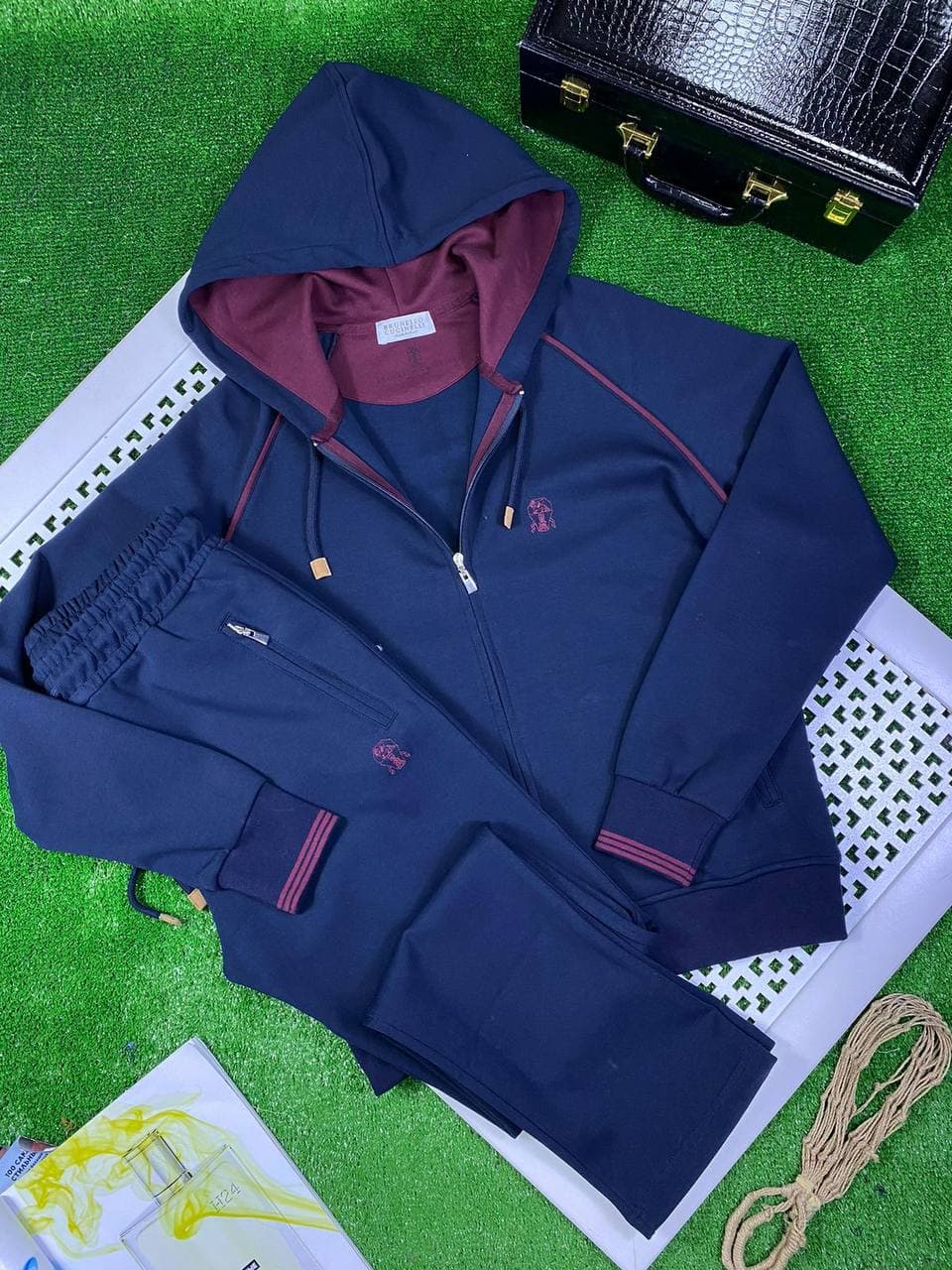 Костюм спортивный Brunello Cucinelli LUX-62441 представляет собой элегантный выбор для повседневного стиля, сочетающий комфорт и узнаваемый бренд. Этот спортивный костюм выполнен в классическом темно-синем цвете с контрастной бордовой отделкой, что придает ему утонченный вид. Костюм идеально подходит для создания расслабленных, но стильных образов, будь то домашний отдых или прогулка.