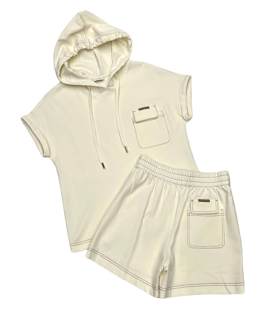 Этот спортивный костюм Brunello Cucinelli LUX-64808 представляет собой стильный и комфортный комплект, состоящий из укороченной толстовки с капюшоном и шорт. Дизайн сочетает в себе элементы спортивной одежды и повседневного стиля, делая его универсальным для различных ситуаций.