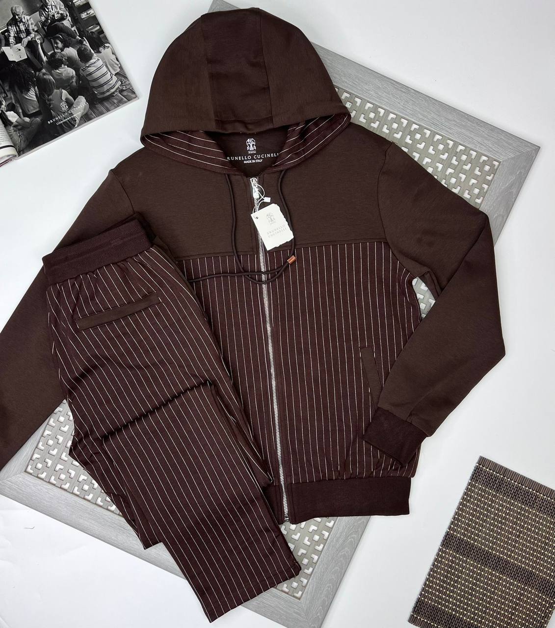 Костюм спортивный Brunello Cucinelli LUX-75283 — это стильный и комфортный спортивный костюм, выполненный в классическом стиле. Костюм выполнен в насыщенном коричневом цвете с текстурированными полосками на штанах и центральной части куртки. Идеально подходит для повседневной носки, прогулок и активного отдыха.