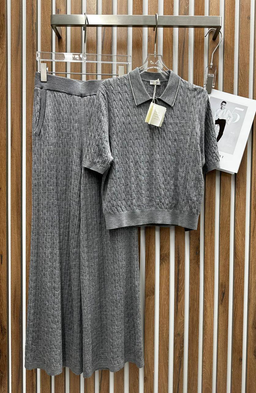 Костюм женский Brunello Cucinelli LUX-109282 представляет собой стильный комплект, включающий в себя топ с короткими рукавами и брюки прямого кроя. Костюм выполнен в элегантном сером цвете, что делает его универсальным для различных образов. Текстура ткани создает интересный визуальный эффект.